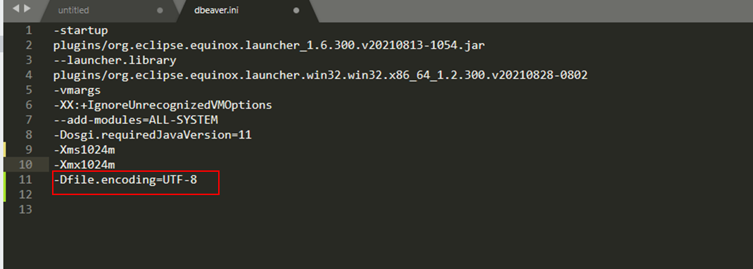์๋์ฒ๋ผ dbeaver.iniํ์ผ์ ์๋ํฐ๋ก ์ด์ด์ ์ธ์ฝ๋ฉ ์ค์ ์ถ๊ฐ