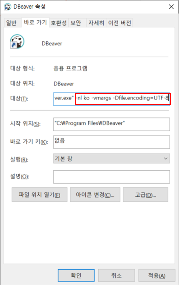 DBeaver ์คํ ํ์ผ - ์์ฑ - ๋์์ -nl ko -vmargs -Dfile.encoding=UTF-8๋ก ์์ ํ DBeaver ์ฌ์คํ