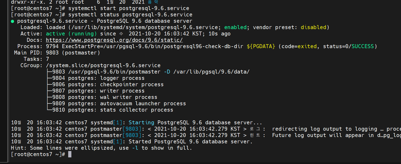 10์ 19 15:30:09 centos7 postmaster[30514]: < 2021-10-19 15:30:09.071 KST > ํํธ: Future log output will appear in …pg_log".