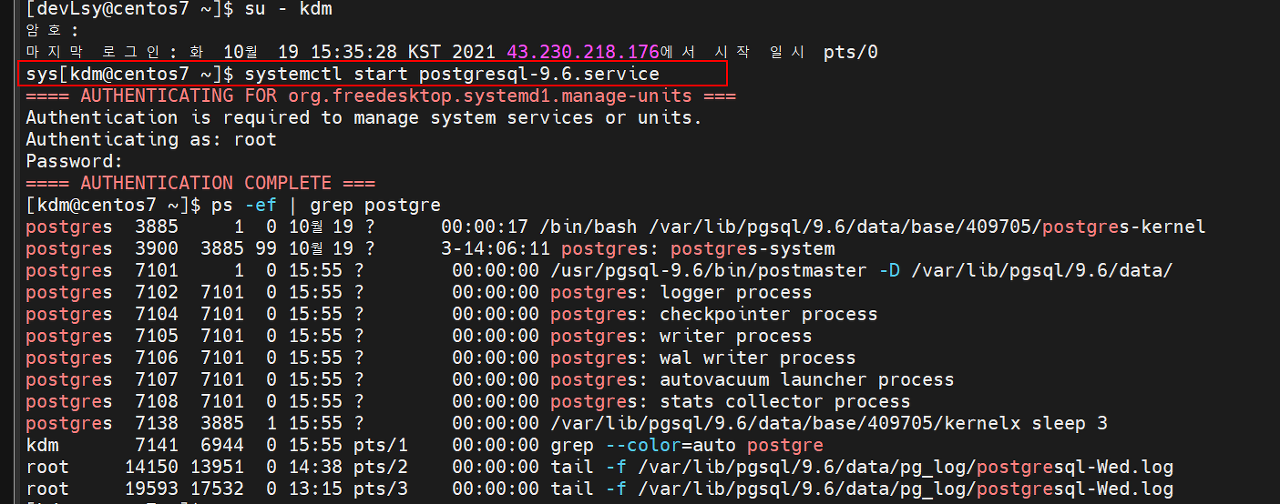 10์ 19 15:30:09 centos7 postmaster[30514]: < 2021-10-19 15:30:09.071 KST > ๋ก๊ทธ: redirecting log output to logging… process