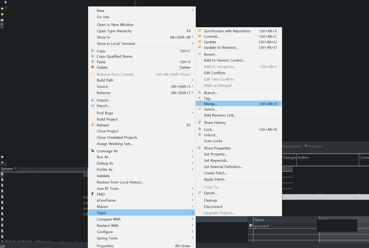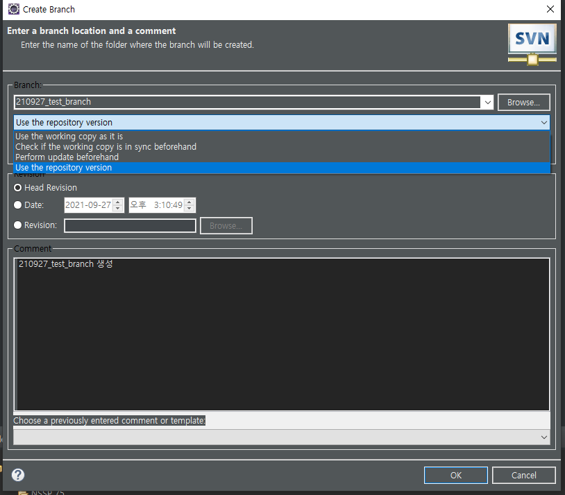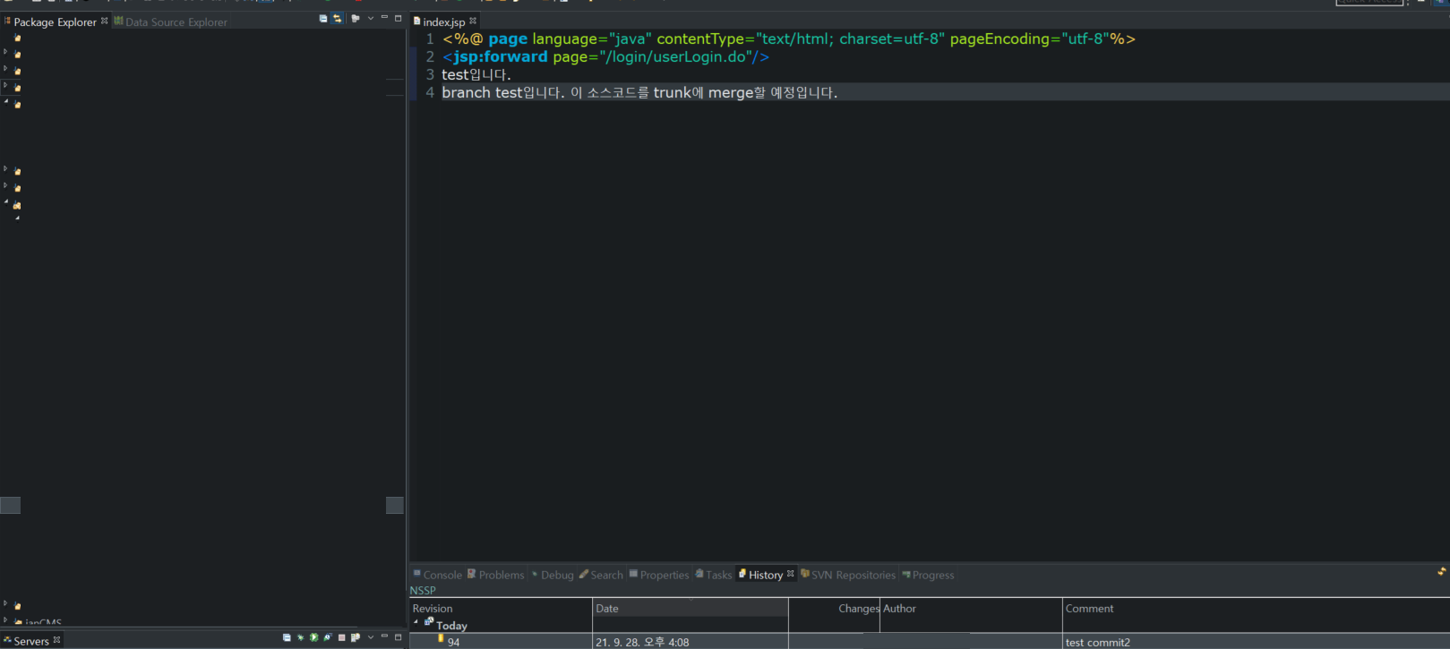 ์์ฒ๋ผ branch์์ ์์ค์ฝ๋๋ฅผ ์์ ํ ๋ค commit์ ํ ์ํ์ด๊ณ ์ด๋ฅผ ๋ฉ์ธ trunk์ ๋ฐ์ํ๊ณ ์ถ์ผ๋ฉด merge ๊ธฐ๋ฅ์ ์ด์ฉํ๋ฉด ๋จ