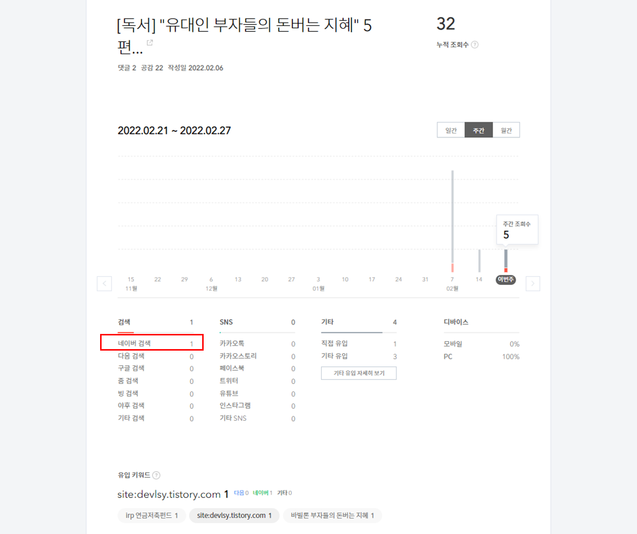 ๊ทธ๋ฌ๋ค ์ด์ ์ฐ์ฐํ ๋ฐฉ๋ฌธ์ ํต๊ณ๋ฅผ ๋ณด๋ค๊ฐ ๋ค์ด๋ฒ ๊ฒ์์ด 1์ด ์๋๊ฒ์ ๋ณด๊ฒ ๋์๋ค.๐