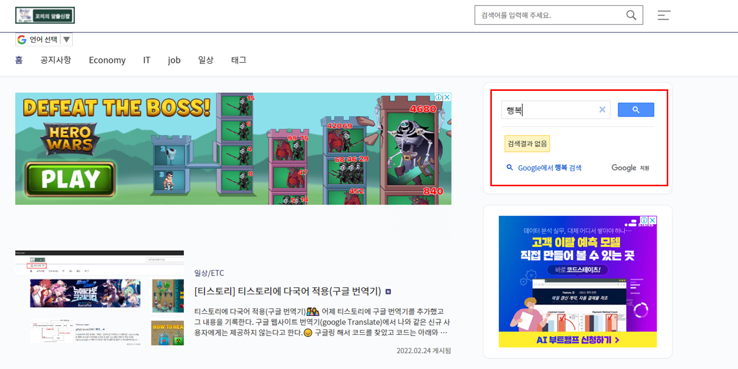 | [ํฐ์คํ ๋ฆฌ] ํฐ์คํ ๋ฆฌ์ ๋ค๊ตญ์ด ์ ์ฉ(๊ตฌ๊ธ ๋ฒ์ญ๊ธฐ) (2) | 2022.11.20 |