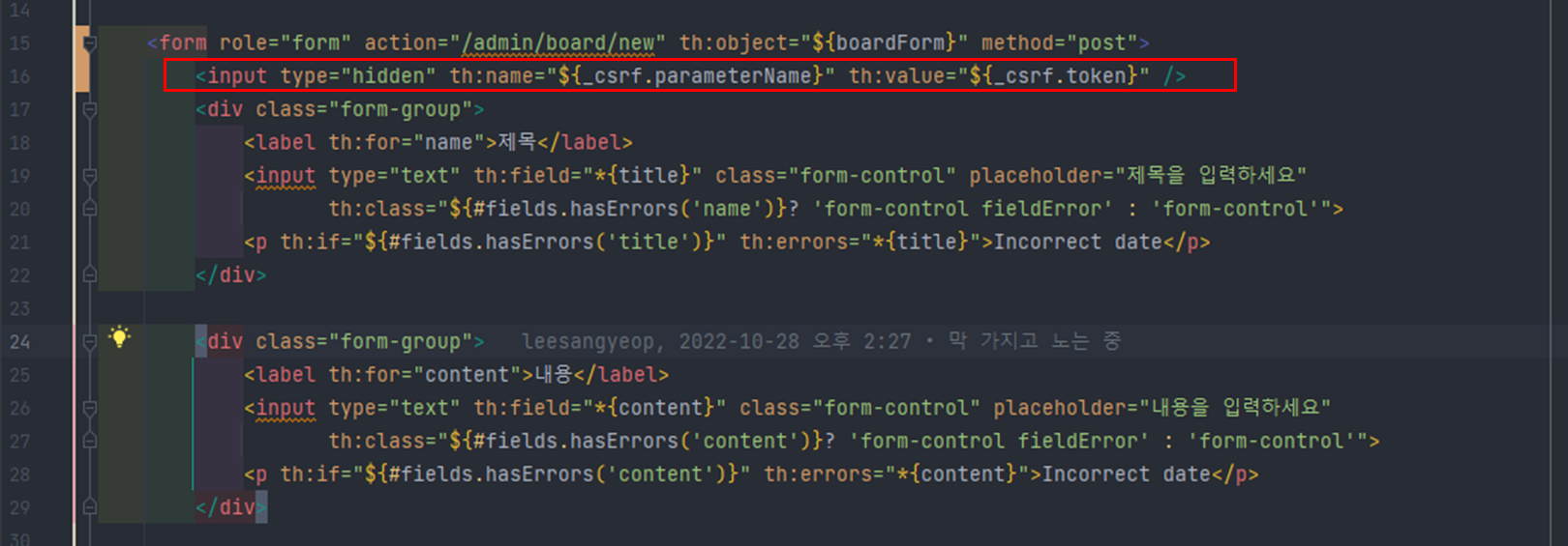 thymeleaf์ th:action์ ์ฌ์ฉํ ๊ฒฝ์ฐ csrf token ์ ์กํ๋ ๋ถ๋ถ์ด ํฌํจ๋์ด ์๋ค๊ณ ํจ