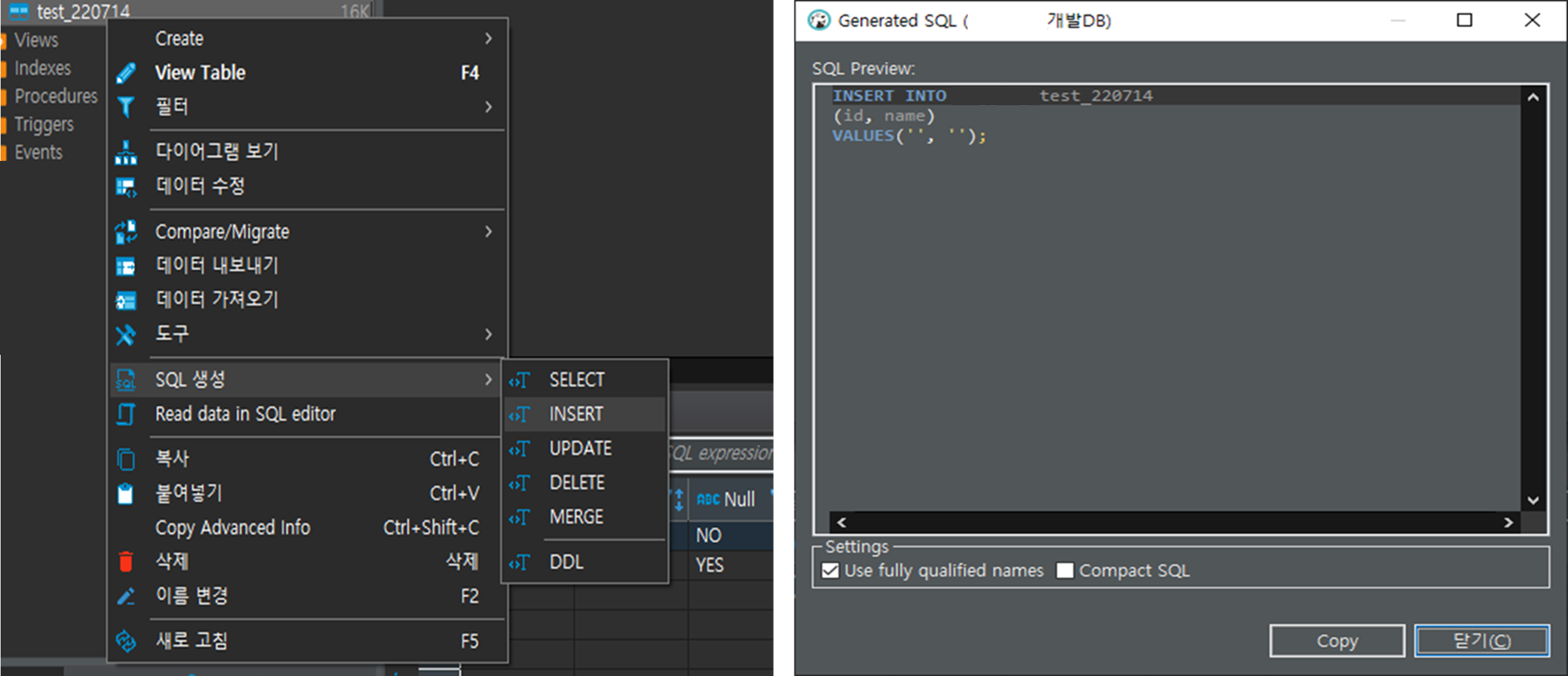 DBeaver์ ๊ฐ์ ํด์ ์ฌ์ฉํ๋ฉด SQL์ ์์ฑํด์ฃผ๋๊น ์ด๋ฅผ ์ด์ฉํ๋ฉด ํธํ๋ค.