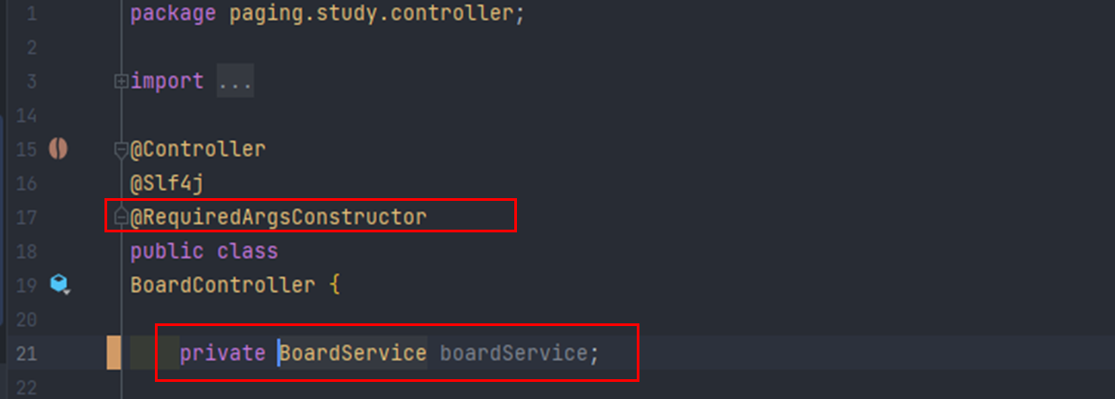 ์ปจํธ๋กค๋ฌ ํด๋์ค๋ ๋ฒจ์ @RequiredArgsConstructor ์ ๋ ธํ ์ด์ ์ ๋ถ์๋๋ฐ boardService์ final์ ๋ถ์ด์ง ์์์ ๊ทธ๋ ๋ค.