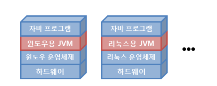 ๋จ, ์๋ฐ ํ๋ก๊ทธ๋จ๊ณผ๋ ๋ฌ๋ฆฌ JVM์ ์ด์์ฒด์ ์ ์ข ์์ ์ด๋ฏ๋ก, ๊ฐ ์ด์์ฒด์ ์ ๋ง๋ JVM์ ์ค์นํด์ผ ํจ