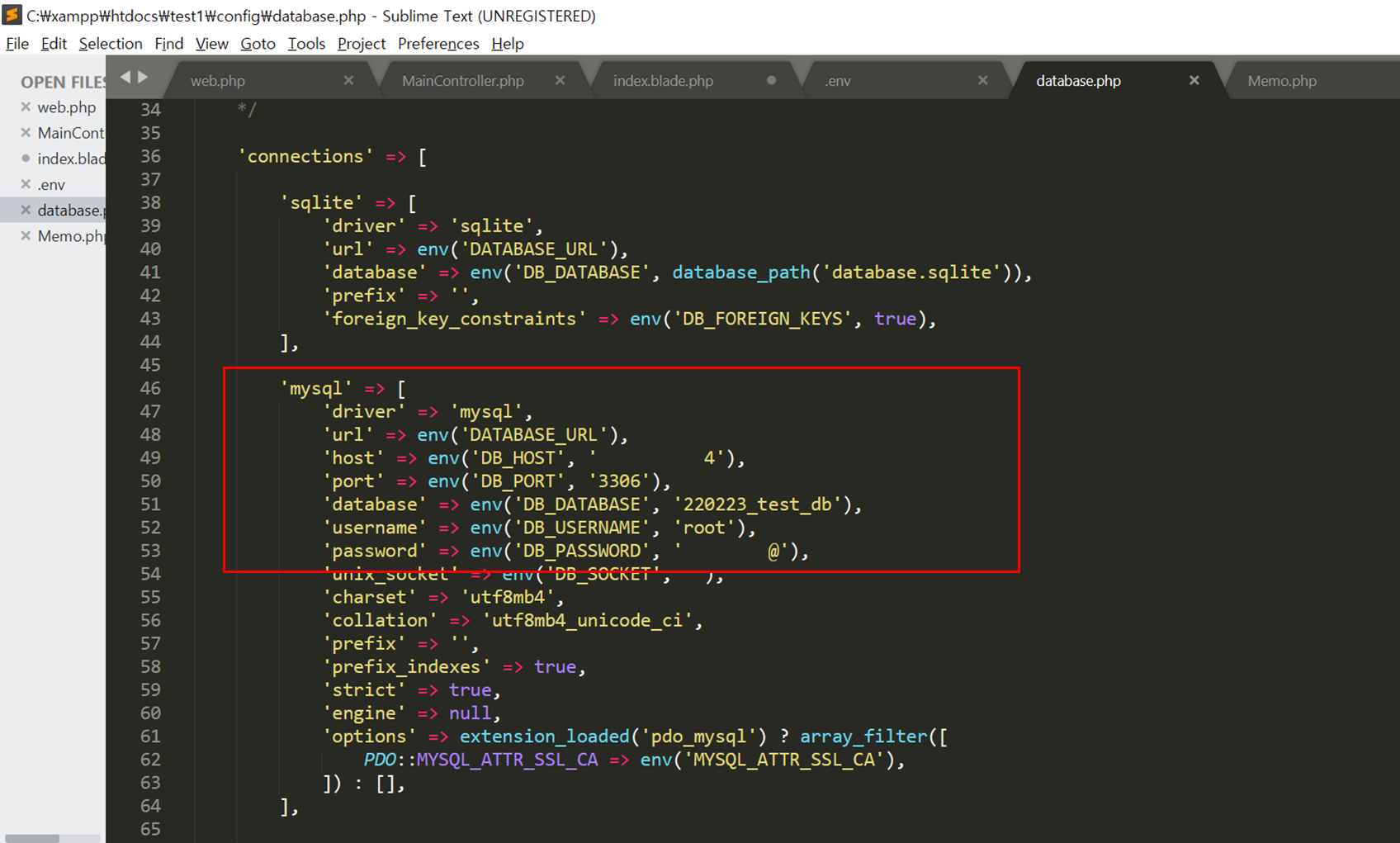 ๊ทธ๋ฆฌ๊ณ config์ database.php์ db์ ์์ ๋ณด๋ฅผ ์์ ํ๋ค.(.env์ ๋ง์ถฐ์)
