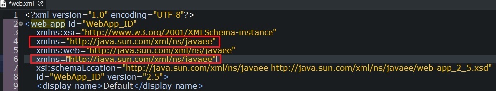 ์์ธ์ ์๋์ ๊ฐ์ด web.xml์ xmlns๊ฐ ์ค๋ณต๋์ด ์์์