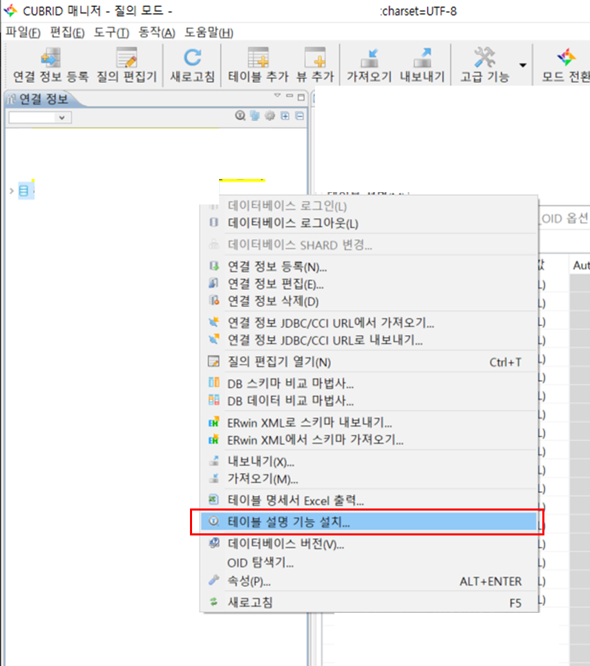 ์๋์ฒ๋ผ cubrid manager ์คํ - ํด๋น db ๋ก๊ทธ์ธ ํ ์ฐํด๋ฆญ - ํ ์ด๋ธ ์ค๋ช ๊ธฐ๋ฅ ์ค์น ์ ํ