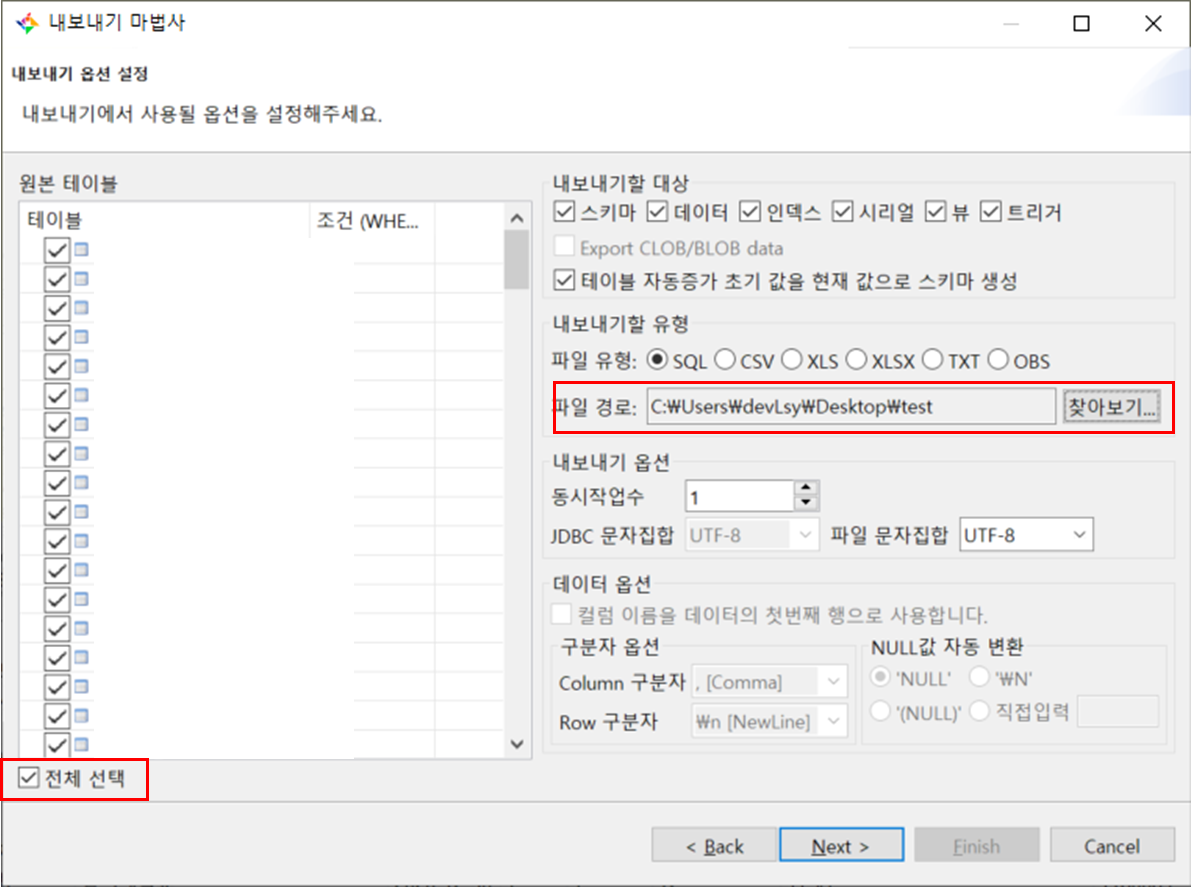 ํ ์ด๋ธ ์ ์ฒด ์ ํ ํน์ ์ํ๋ ํ ์ด๋ธ๋ง ์ ํ, ์ฐ์ธก์ ์ฐพ์๋ณด๊ธฐ์์ sqlํ์ผ์ ์ ์ฅํ ๊ฒฝ๋ก ์ค์ ์ดํ next