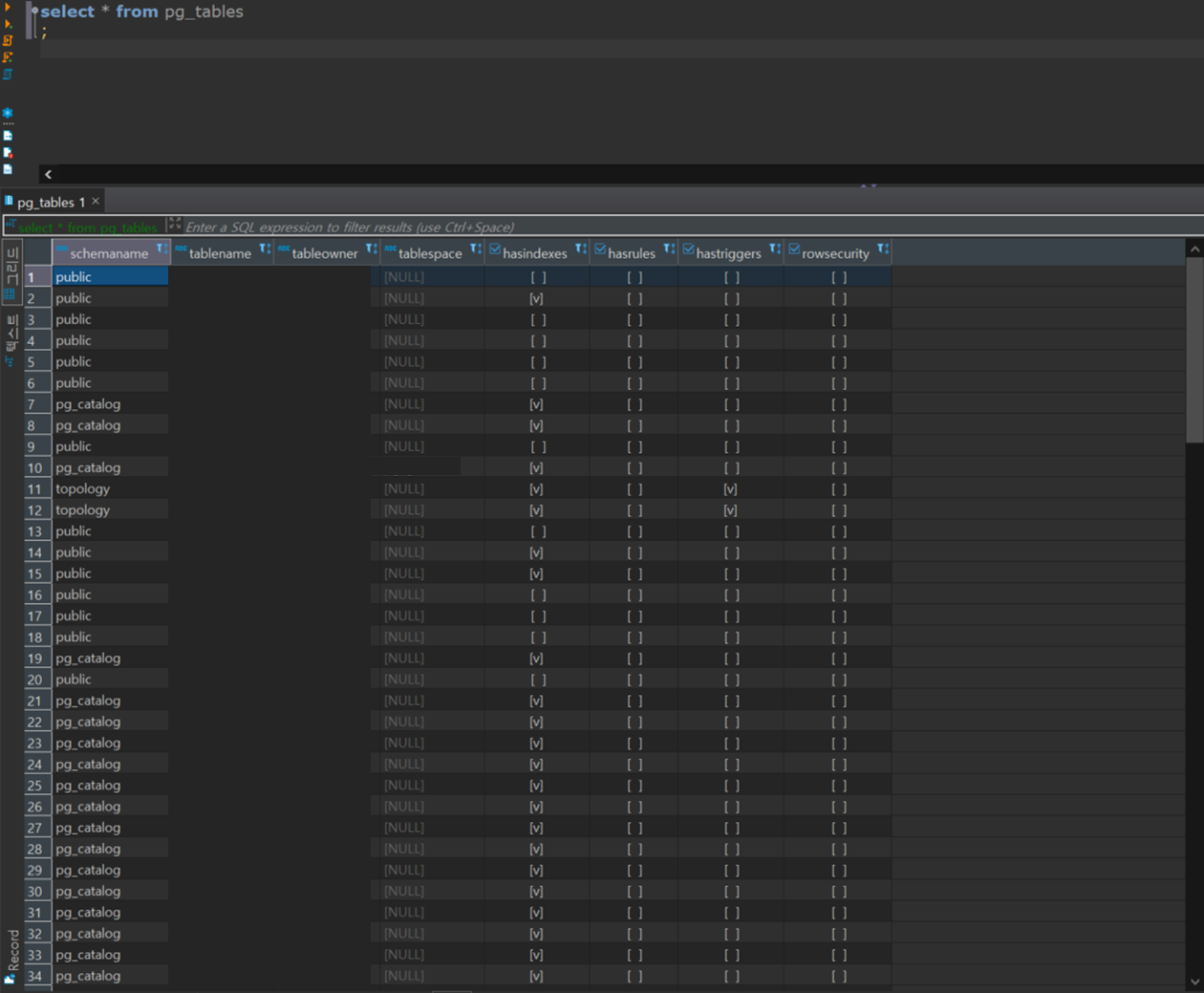 ์๋์ฒ๋ผ pg_tables๋ฅผ ์ด์ฉํ๋ฉด ๋๋ค.