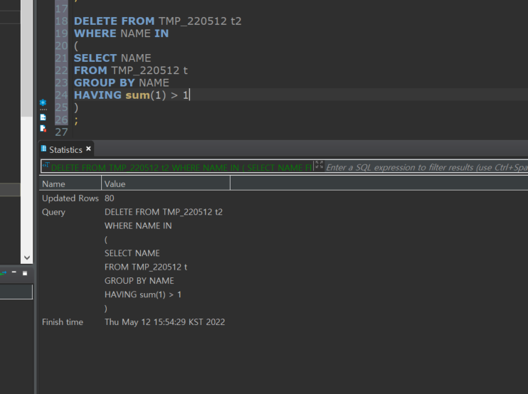 ๊ทธ๊ฑธ ์๋ธ์ฟผ๋ฆฌ์ ๋ฃ์ ํ DELETE๋ฌธ์ผ๋ก ์ญ์