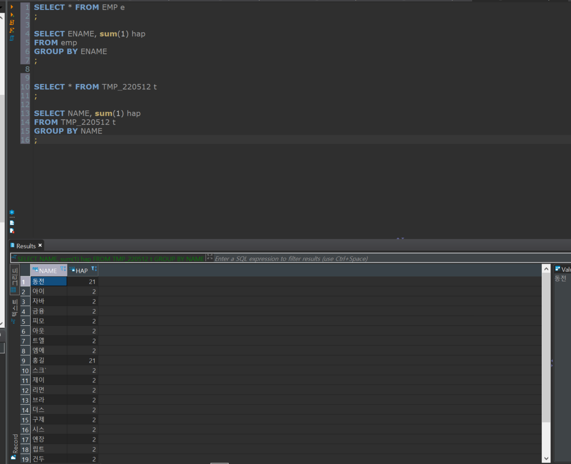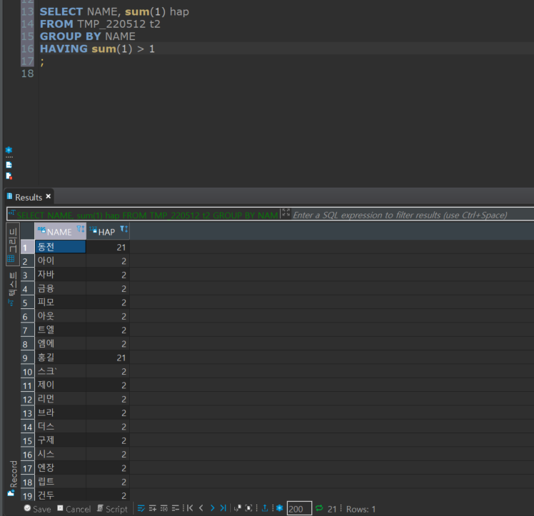 ๊ฒฐ๊ณผ๋ ์๋์ฒ๋ผ name์ด 1๊ฐ ์ด์์ธ ์ค๋ณต๋ฐ์ดํฐ๊ฐ ์กฐํ๋๋ค.