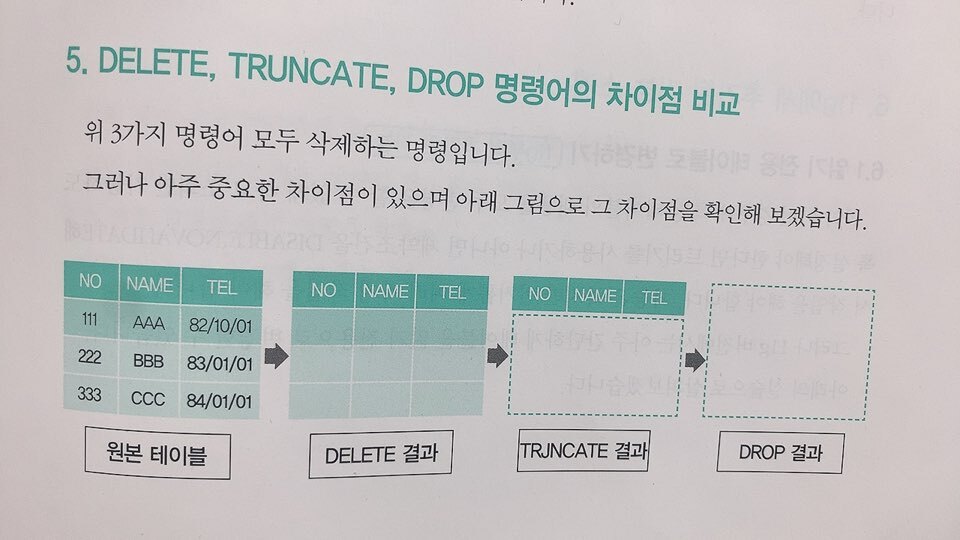 delete๋ ๋ฐ์ดํฐ๋ง ์ง์์ง๊ณ ์ฌ์ฉ์ค์ธ ๋์คํฌ์์ ๊ณต๊ฐ์ ์ ์ง, TRUNCATE๋ CREATE TABLE๋ก ํ ์ด๋ธ์ ๋ง๋ค์๋ ์ํ(๋ฐ์ดํฐ๊ฐ 1๋ ์์)๋ก ๋ชจ๋ ๋ฐ์ดํฐ๋ฅผ ์ญ์ ํ๊ณ ์ปฌ๋ผ๋ง ๋จ๊ฒจ๋์, ์ฌ์ฉ์ค์ธ ๋์คํฌ ๊ณต๊ฐ๋ ์ฌ๋ผ์ง, DROP์ ์ ์ผ ์ํํ ๋ช ๋ น์ด์ด๊ณ ๋ฐ์ดํฐ์ ํ ์ด๋ธ ์ ์ฒด๋ฅผ ์ญ์ ํจ(์ฌ์ฉ์ค์ธ ๊ณต๊ฐ, ์ธ๋ฑ์ค, ์ ์ฝ์กฐ๊ฑด๋ฑ ์ ๋ถ ์ญ์ ๋จ)