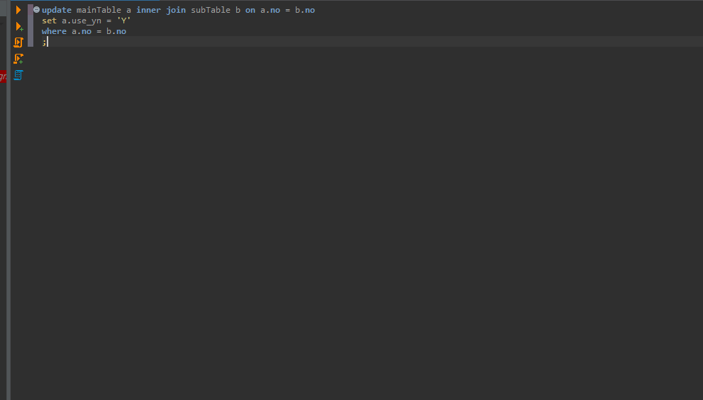 -- mainTable๊ณผ subTable์ no๋ก ์กฐ์ธํ ๋ค no๊ฐ ๊ฐ์ ๋ฐ์ดํฐ๋ง use_yn๊ฐ์ 'Y'๋ก ๋ณ๊ฒฝ