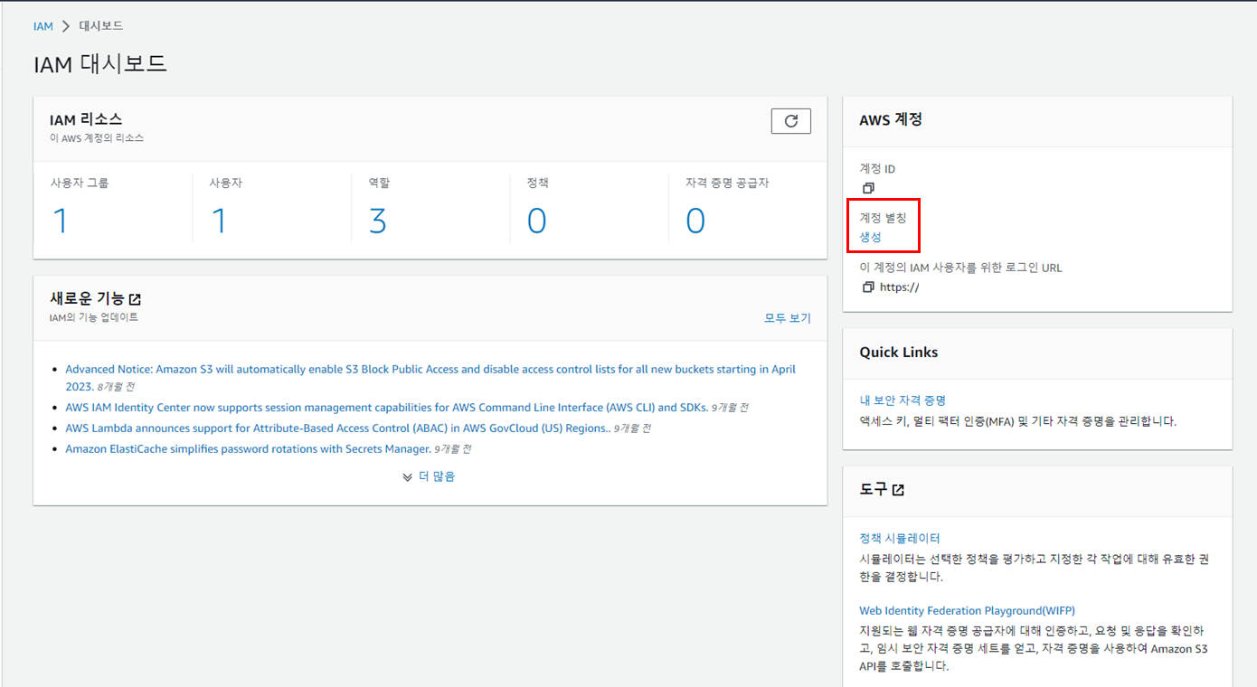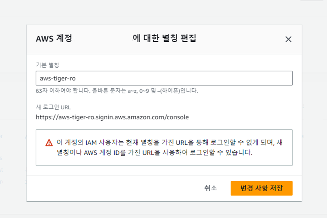 ๋์๋ณด๋ > ์ฐ์ธก AWS ๊ณ์ > ๊ณ์ ๋ณ์นญ ์์ฑ