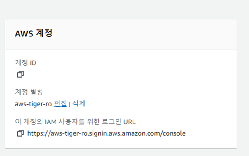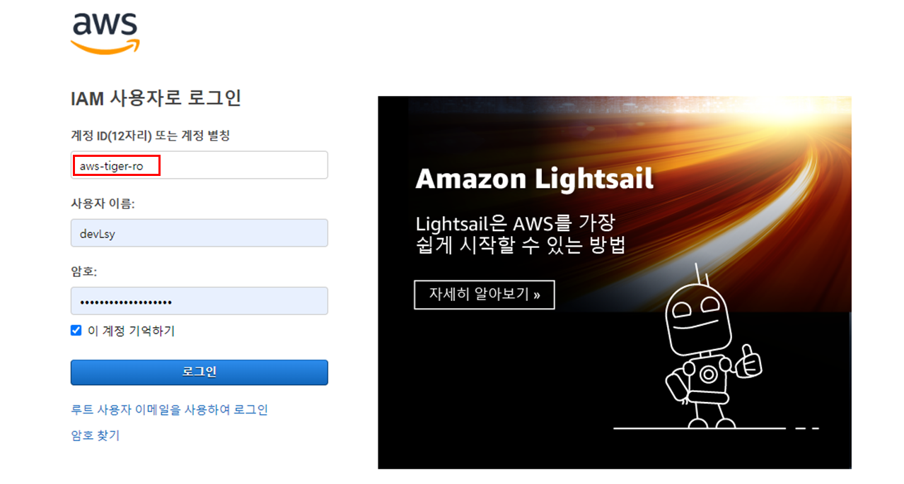 ์ดํ๋ถํฐ IAM์ฌ์ฉ์๋ ์์ฑํ ๊ณ์ ๋ณ์นญ์ผ๋ก ๋ก๊ทธ์ธ ํ ์ ์๋ค.(๋ณด์ ์ธก๋ฉด๊ณผ ์ฌ์ฉ์ ํธ์๋ฅผ ์ํด์๋ ์ข๋ค.)