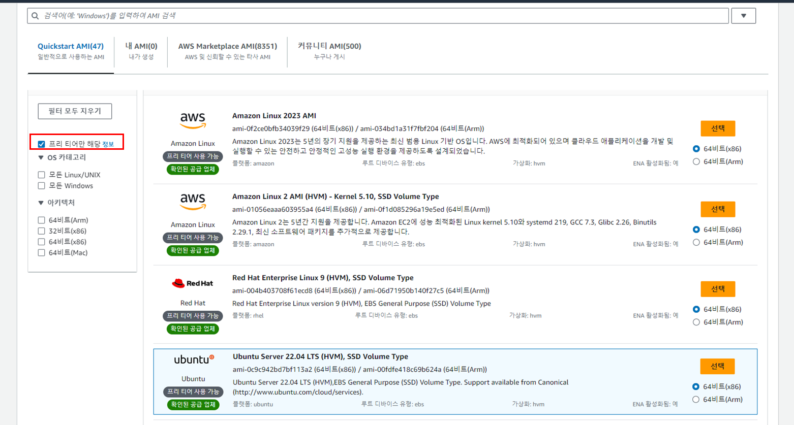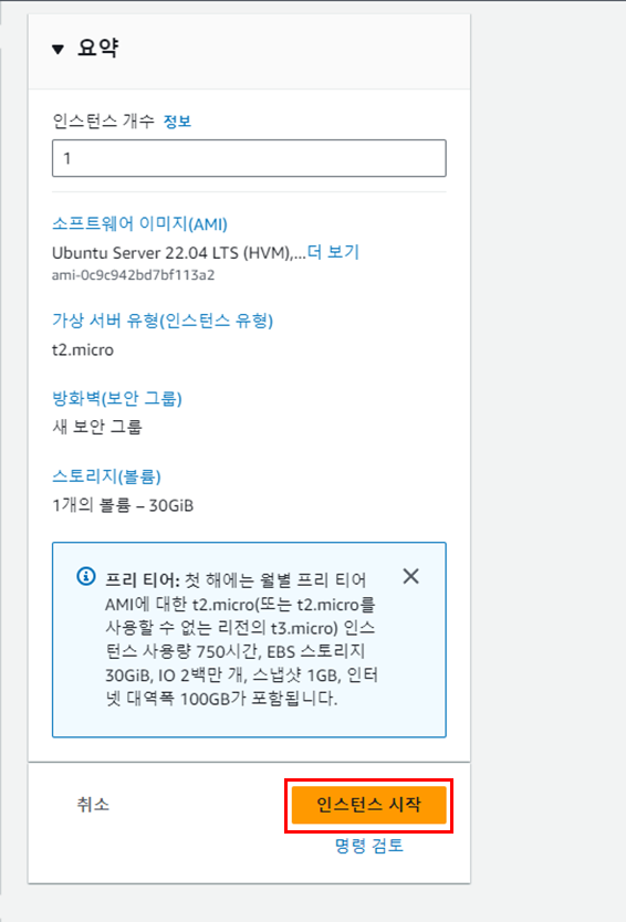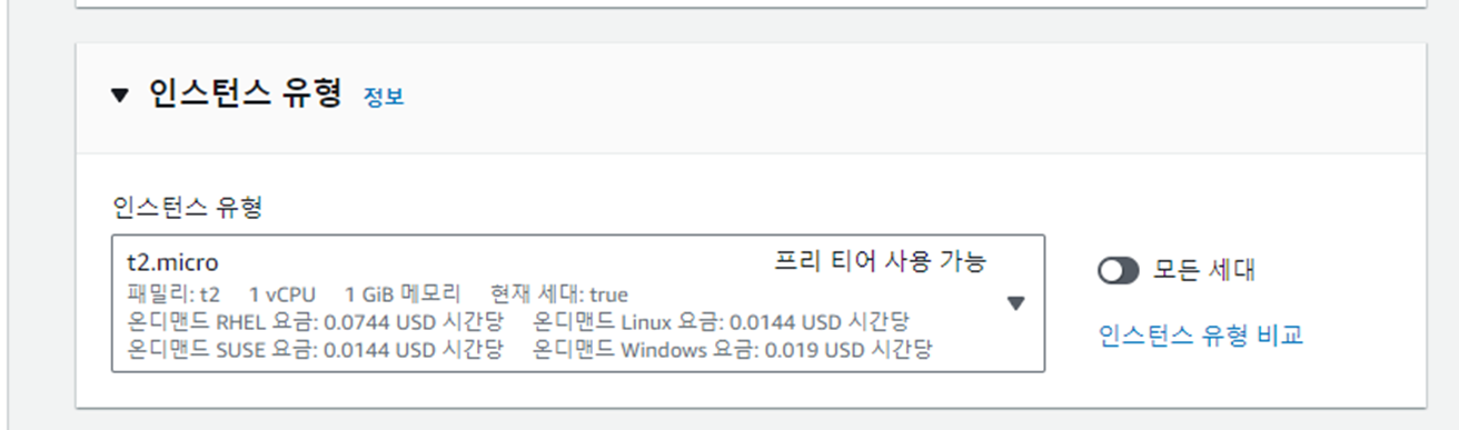 ์ธ์คํด์ค ์ ํ ์ ํ(ํ๋ฆฌํฐ์ด๋ t2.micro๋ฐ์ ์์)