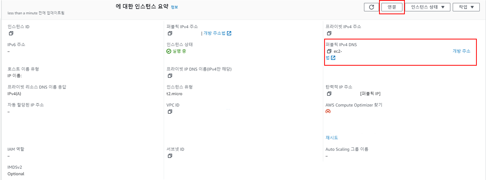 ์ธ์คํด์ค ๋๋ฅด๋ฉด ์๋์ฒ๋ผ ์ธ์คํด์ค ์์ฝ์ด ํ์๋๊ณ ํผ๋ธ๋ฆญ IPv4 DNS๋ณด๋ฉด ํ๋ ฅ์ IP๊ฐ ์ ์ฉ์ด ๋์๋ค.