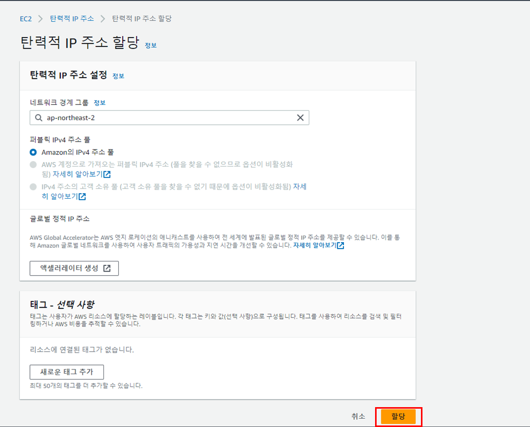 ํผ๋ธ๋ฆญ IP ์๋ ํ ๋น์ ๋นํ์ฑํ๋ก ์ ํํ๋ค.(ํ๋ ฅ์ IP ์ฌ์ฉํด์ ๊ณ ์ ์์ดํผ๋ฅผ ํ ๋น ํ ์์ )