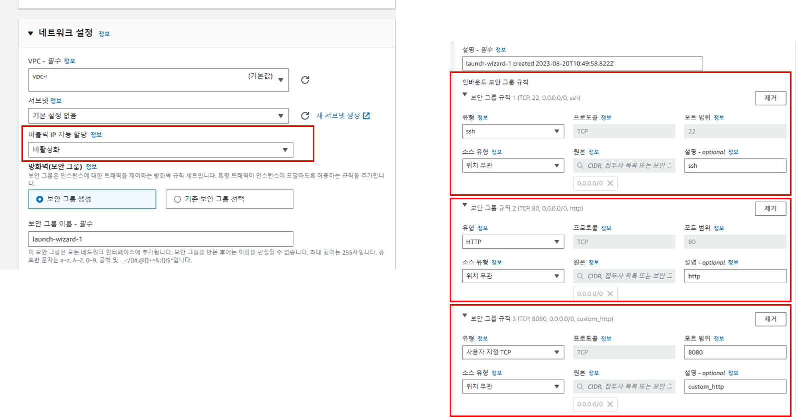 ssh ํต์ ์ํด 22๋ฒ ํฌํธ, HTTP ํต์ ์ํด 80 ํฌํธ, ๊ฐ๋ฐ ์ ์ฉ 8080ํฌํธ(์ด๊ฑด ์ ํ์ฌํญ)