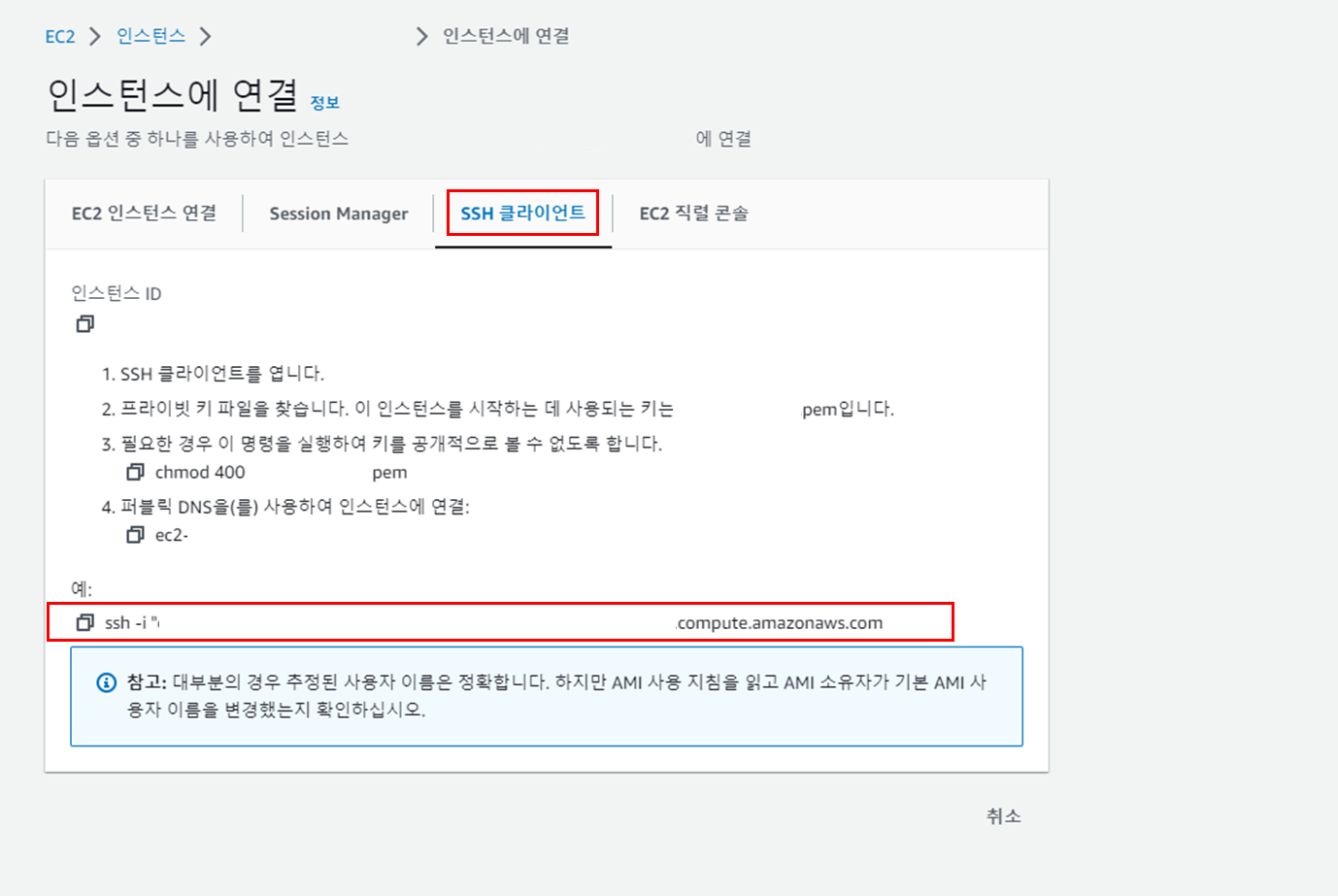 SSH ํด๋ผ์ด์ธํธ ํญ์ ์ ํ ํ ํ๋จ ssh -i๋ก ์์ํ๋ ๋ช ๋ น์ด๋ฅผ ๋ณต์ฌํ๋ค.