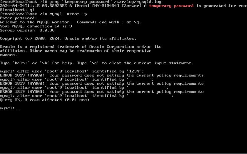 grep์ผ๋ก root๊ณ์ ์์ ๋น๋ฐ๋ฒํธ ํ์ธ ํ mysql root ๊ณ์ ์ผ๋ก ์ ์ ํ ๋น๋ฐ๋ฒํธ๋ฅผ ๋ณ๊ฒฝํด์ค๋ค.