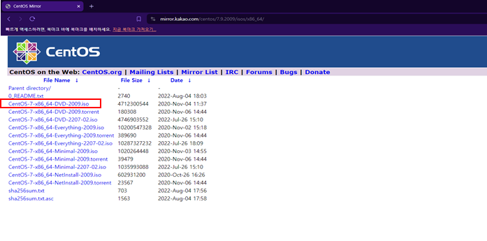 CentOS ๋ฏธ๋ฌ ์ฌ์ดํธ์์ isovํ์ผ ๋ค์ด๋ก๋ํ๋ค.(์ฌ๊ธฐ์ GUIํ๊ฒฝ์ผ๋ก ์ค์นํ๊ธฐ ์ํด DVD ์ ํ)