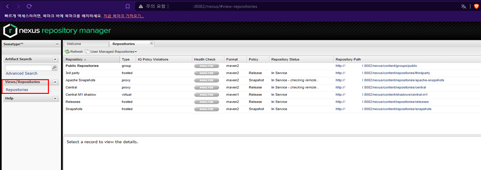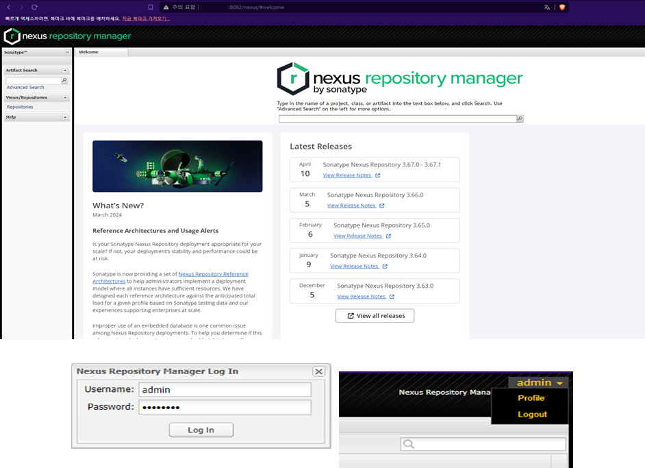 ๋ธ๋ผ์ฐ์ ์์ ์๋ฒ์์ดํผ:8082/nexus๋ก url ํธ์ถ ์ ํ๋ฉด์ด ํ์๋๋์ง ํ์ธ ํ admin/admin123์ผ๋ก ๋ก๊ทธ์ธ ํ ๋น๋ฐ๋ฒํธ๋ฅผ ๋ณ๊ฒฝํ๋ค.