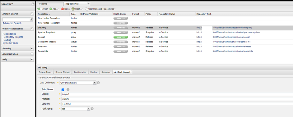 3rd party > ์๋ ๋ฉ๋ด์์ Artifact Upload > GAV Parameters๋ฅผ ์ ํ ํ Group, Artifact, Version์ ๋ ฅ ํ Packaging์ jar๋ก ์ ํํ๋ค