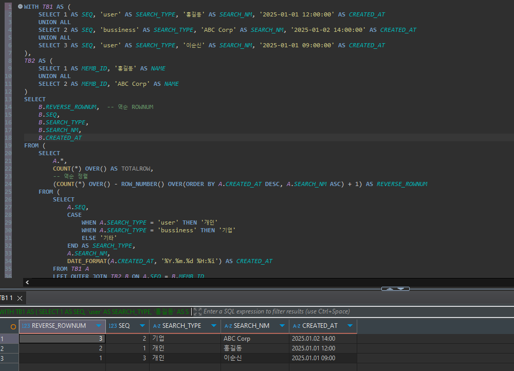(COUNT(*) OVER() - ROW_NUMBER() OVER(ORDER BY A.CREATED_AT DESC, A.SEARCH_NM ASC) + 1) AS REVERSE_ROWNUM