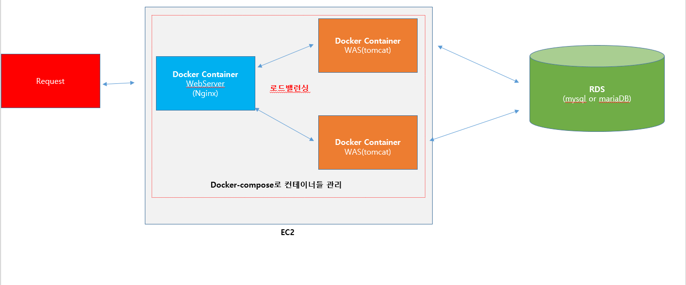๊ฐ๋ณ EC2 ์ธ์คํด์ค์ Docker๋ก Web, Was 1, Was 2๋ฅผ ๊ตฌ์ถ ํ DB์ ์ฐ๋