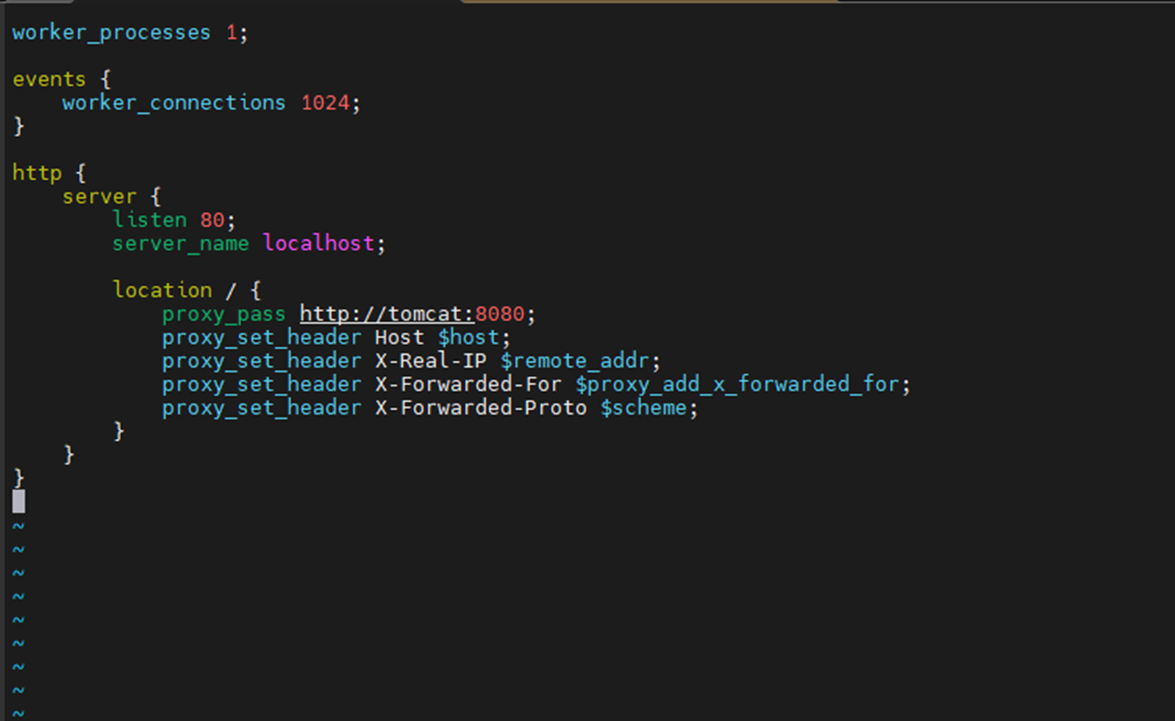 ์คํธ๋๊น server_name์ ๋ก์ปฌ๋ก ์ค์ ํ๋ค.์ค์ํ ๋ถ๋ถ์ proxy_pass์ "http://tomcat:8080"์ tomcat์ docker-compose.yml์์ ์ค์ ํ ์๋น์ค๋ช