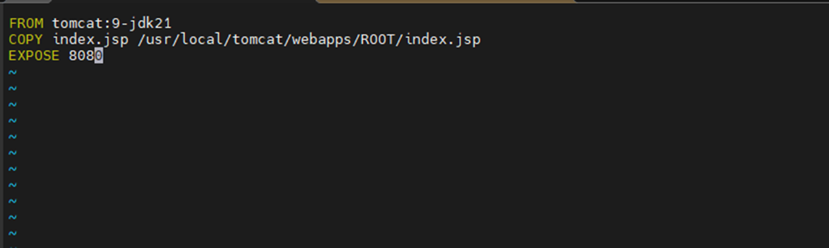 tomcat9๋ฒ์ + jdk21 ์ด๋ฏธ์ง๋ฅผ ๊ฐ์ ธ์์ index.jsp๋ฅผ ๋ณต์ฌ ํ ๋ค 8080์ผ๋ก ํฌํธ๋ฅผ ์ค์ ํ๋ค.