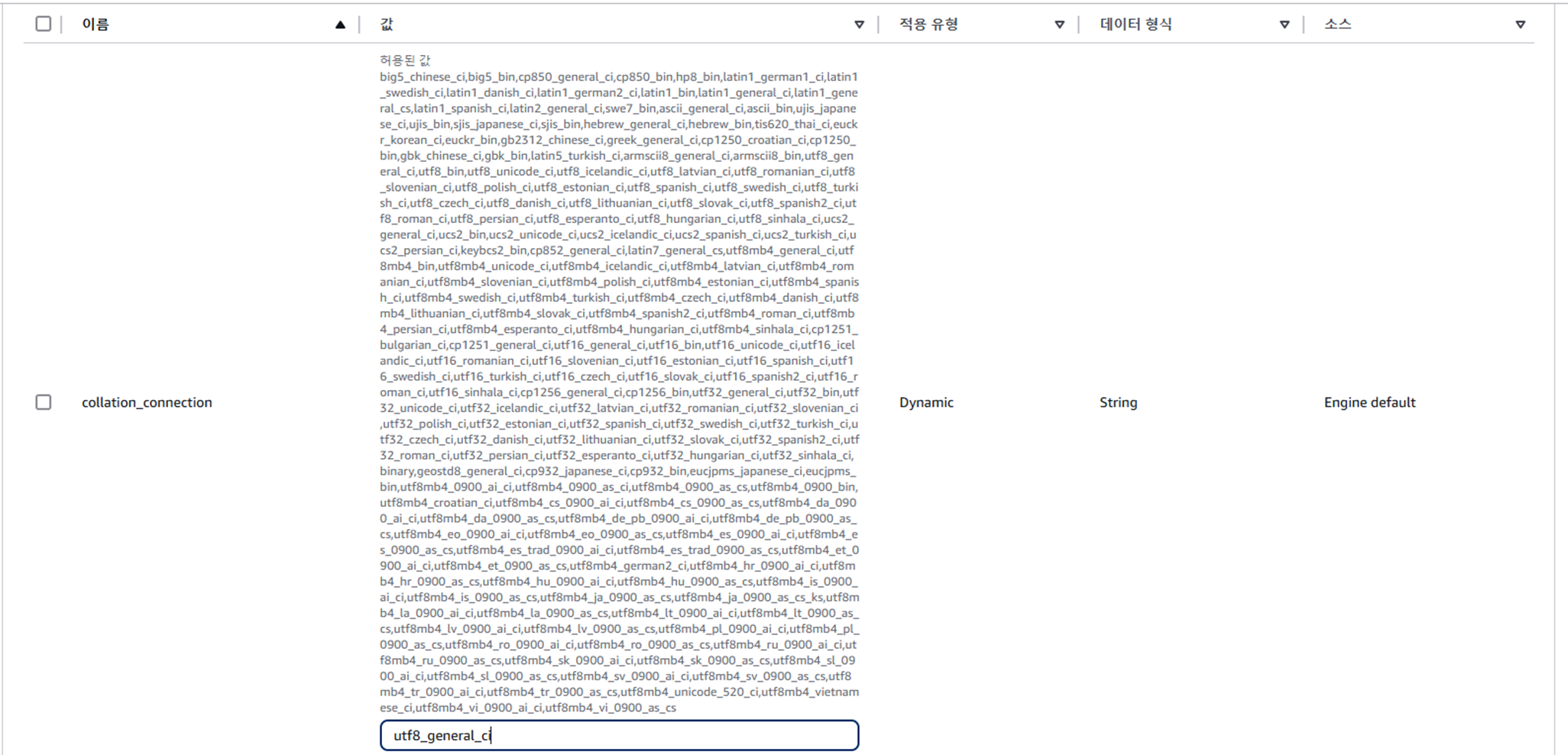 "coll" ์ ๋ ฅ ํ ์๋ ํญ๋ชฉ์ ๊ฐ์ utf8_general_ci๋ก ์ ๋ ฅ ํ๋ค.
