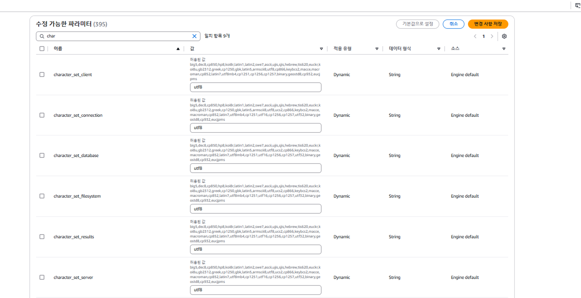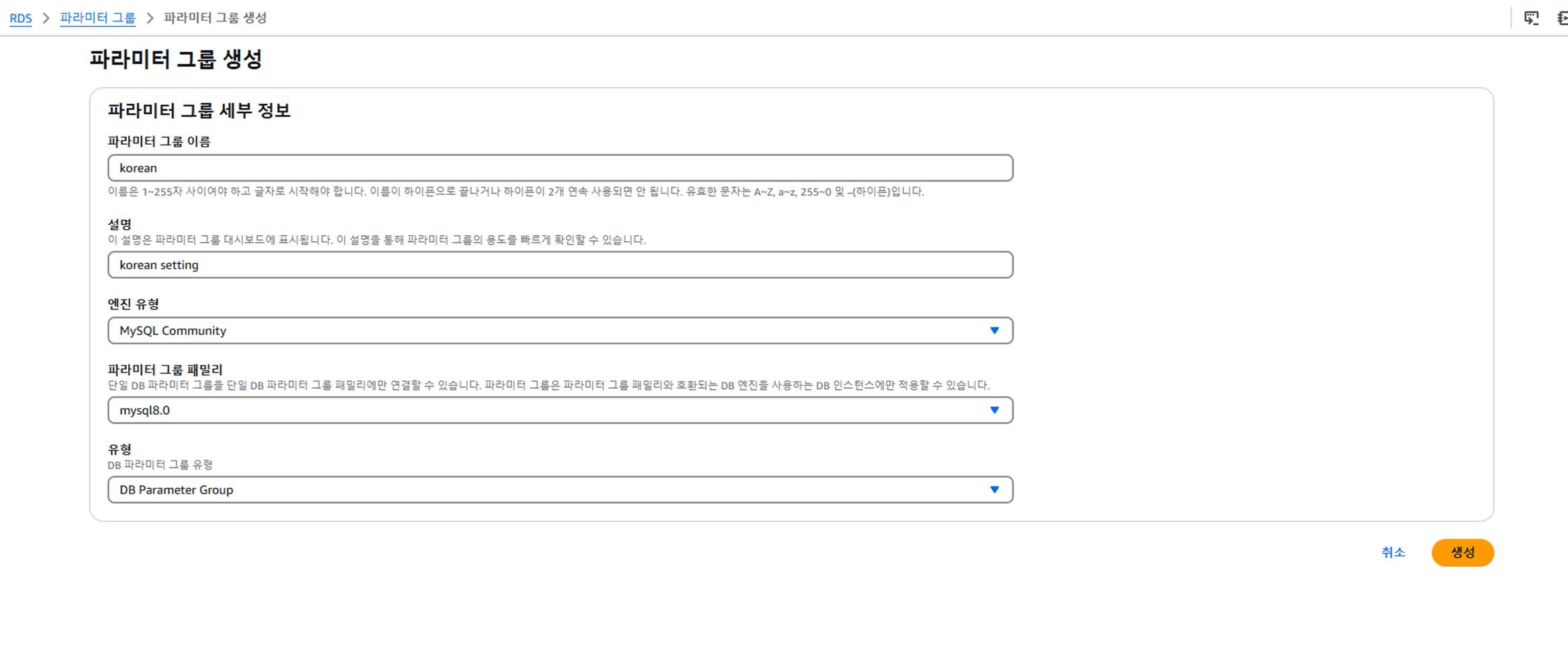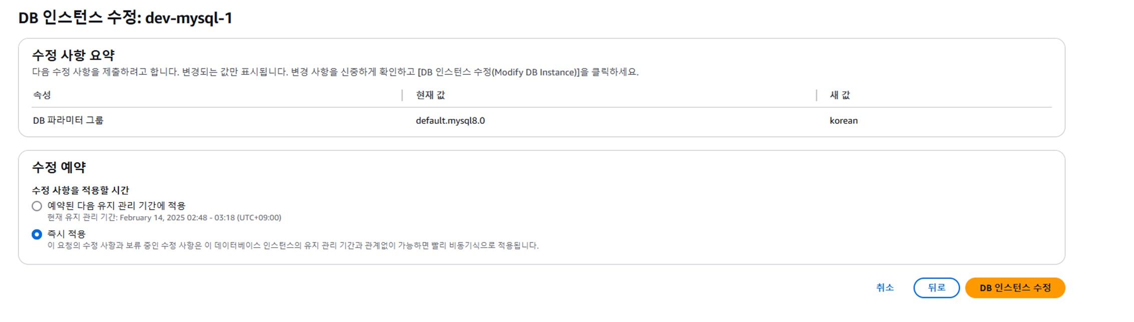 ์๋ ๋ถ๋ถ์ ๋ฐ์ดํฐ๋ฒ ์ด์ค ์ต์ ์ DB ํ๋ผ๋ฏธํฐ ๊ทธ๋ฃน์์ ์๊น ๋ง๋ ํ๋ผ๋ฏธํฐ ๊ทธ๋ฃน์ผ๋ก ๋ณ๊ฒฝ ํ ๊ณ์์ ๋๋ฅธ๋ค.