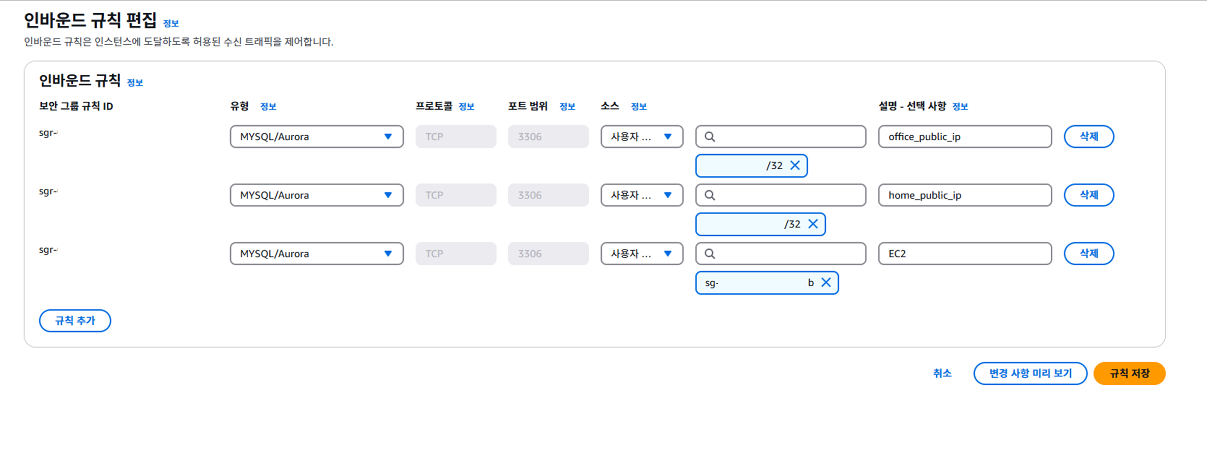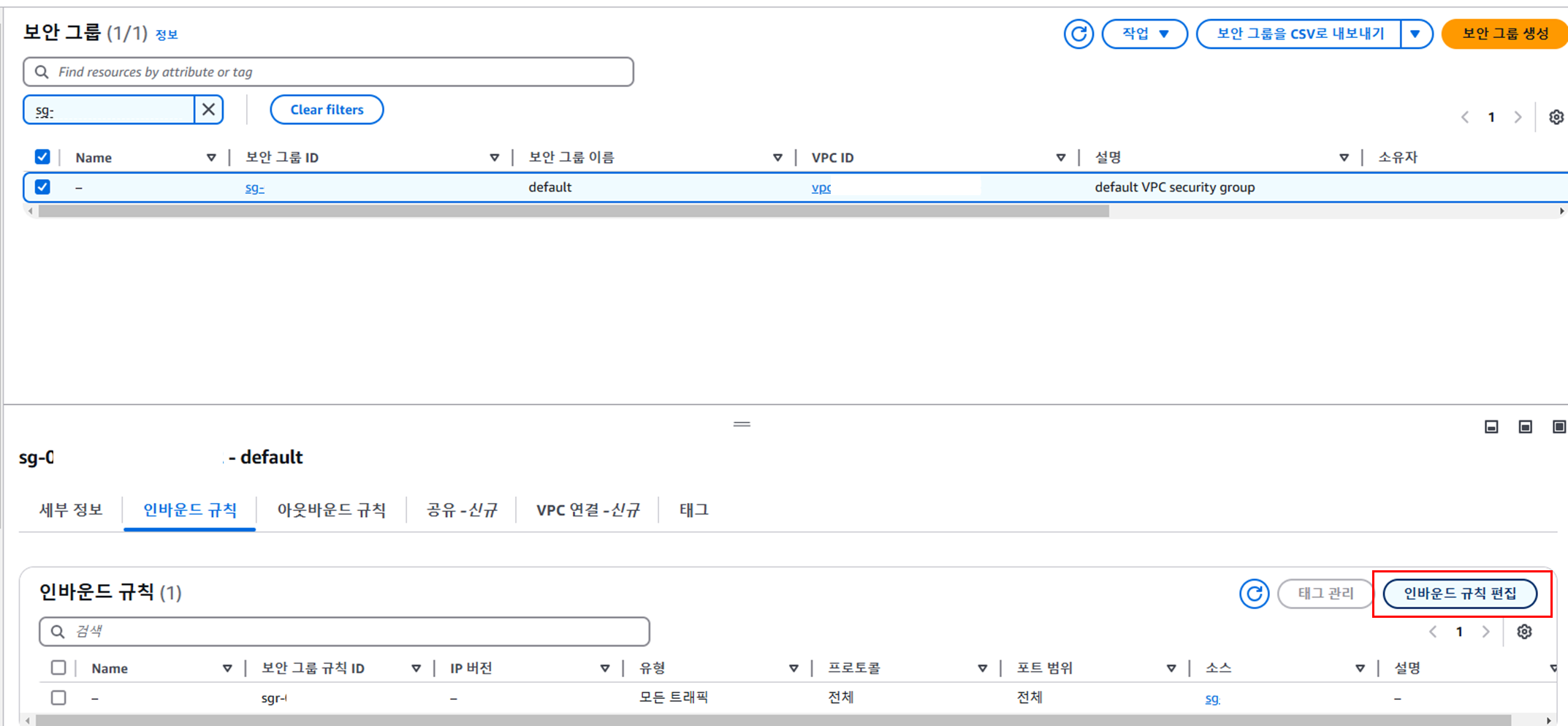 VPC ๋ณด์ ๊ทธ๋ฃน๋ ๊ธฐ์กด ํญ๋ชฉ ์ ํ ์ฒดํฌ