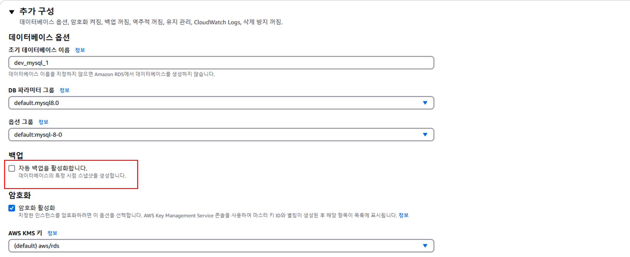 ๋ฐ์ดํฐ๋ฒ ์ด์ค ์ต์ ์์ ์ด๊ธฐ ๋ฐ์ดํฐ๋ฒ ์ด์ค ์ด๋ฆ ํ ์๋ ๋ฐฑ์ ํ์ฑํ๋ฅผ ์ฒดํฌ ํด์ ํ๋ค.(๊ณผ๊ธ ๋ฐฉ์ง)
