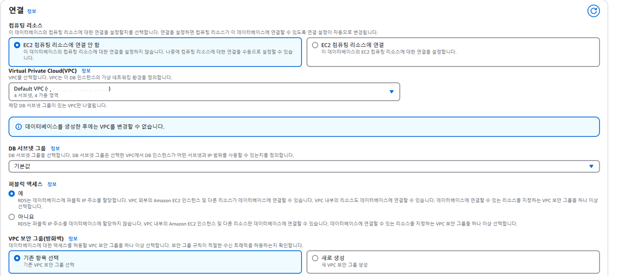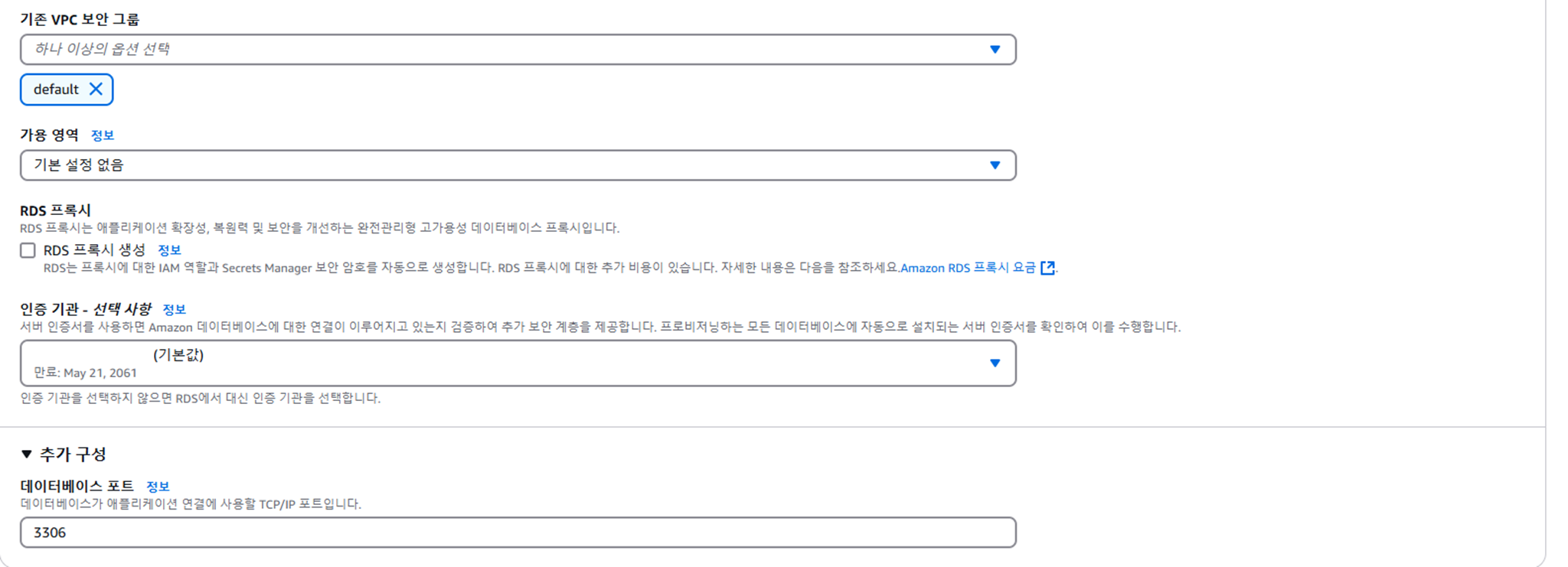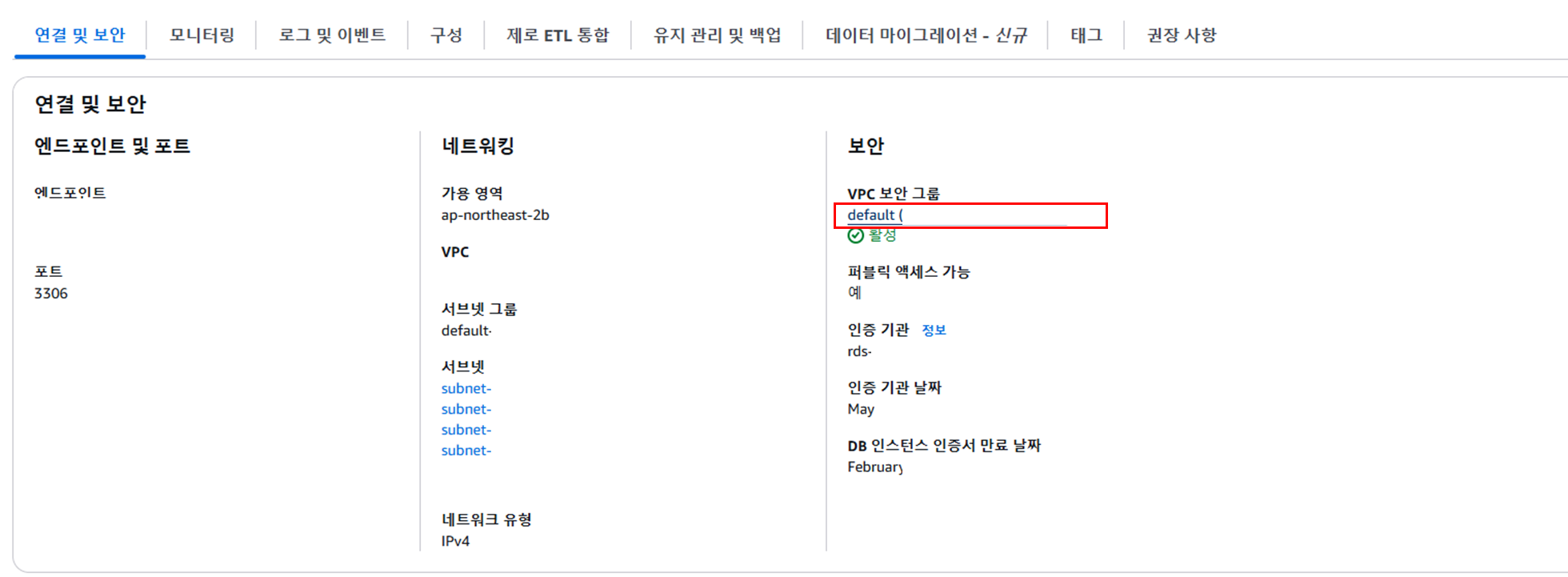 ๋ฐ์ดํฐ๋ฒ ์ด์ค ๋ฉ๋ด์์ ๋ณด์ VPC ๋ณด์ ๊ทธ๋ฃน์ default๋ฅผ ์ ํํ๋ค.