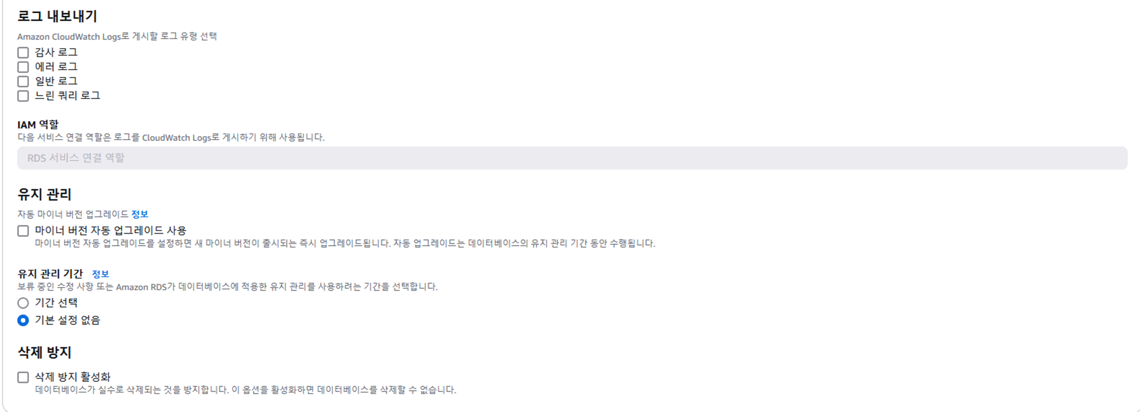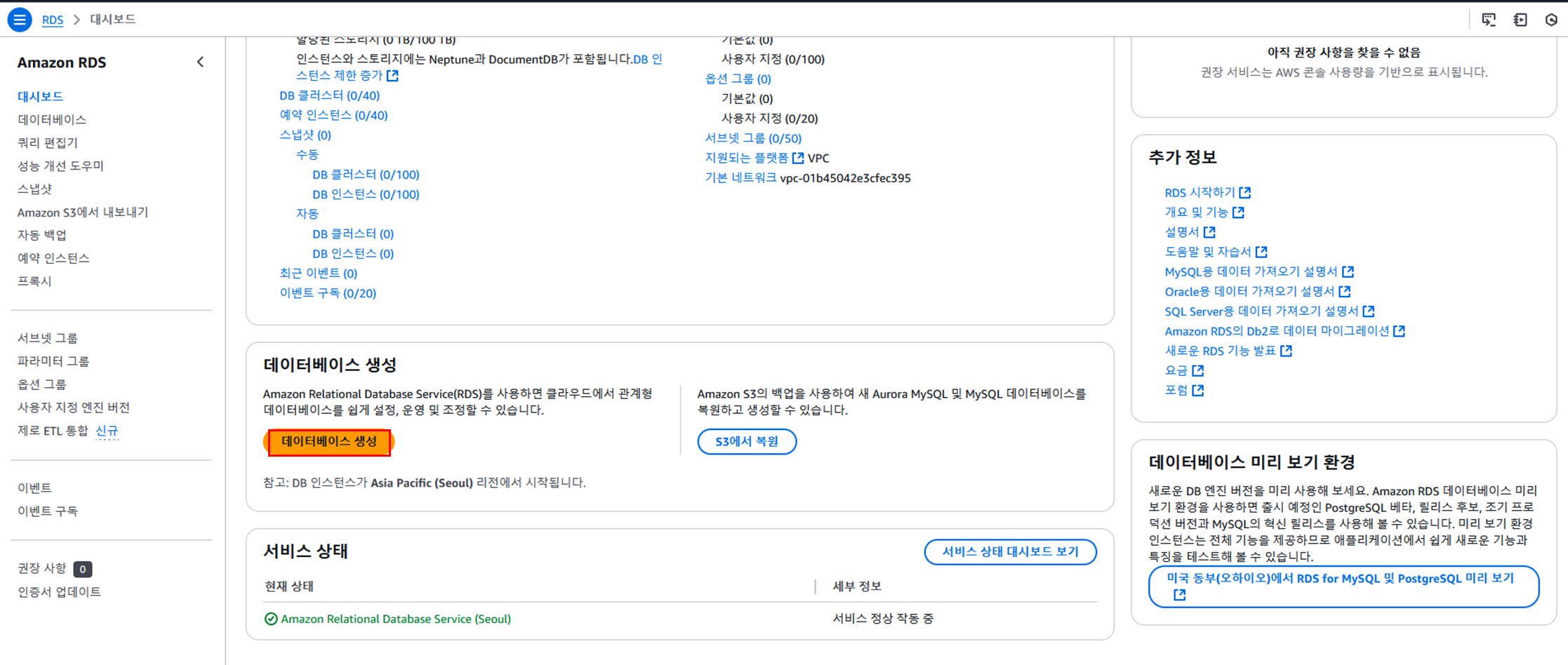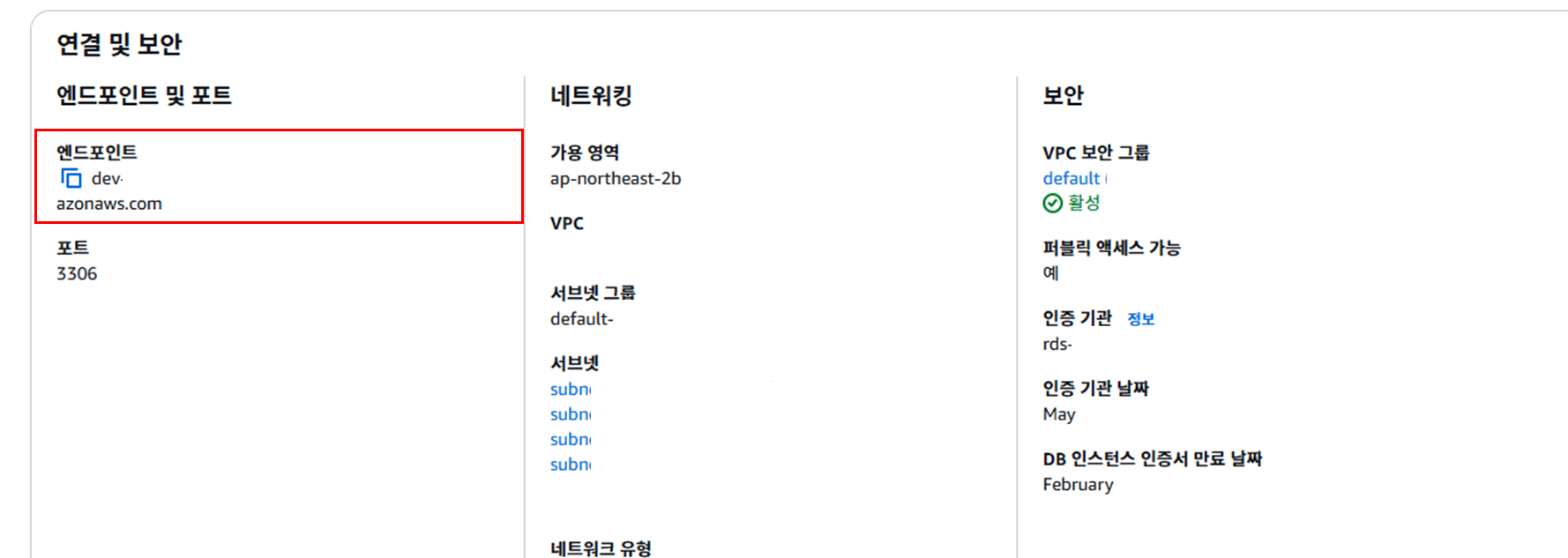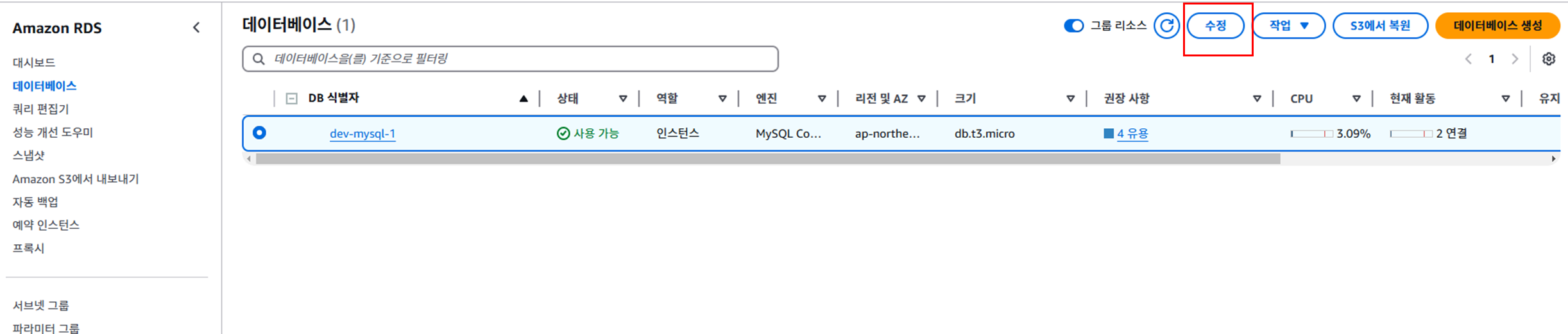 ๋ฐ์ดํฐ๋ฒ ์ด์ค ๋ฉ๋ด์์ ๋ณด์ VPC ๋ณด์ ๊ทธ๋ฃน์ default๋ฅผ ์ ํํ๋ค.