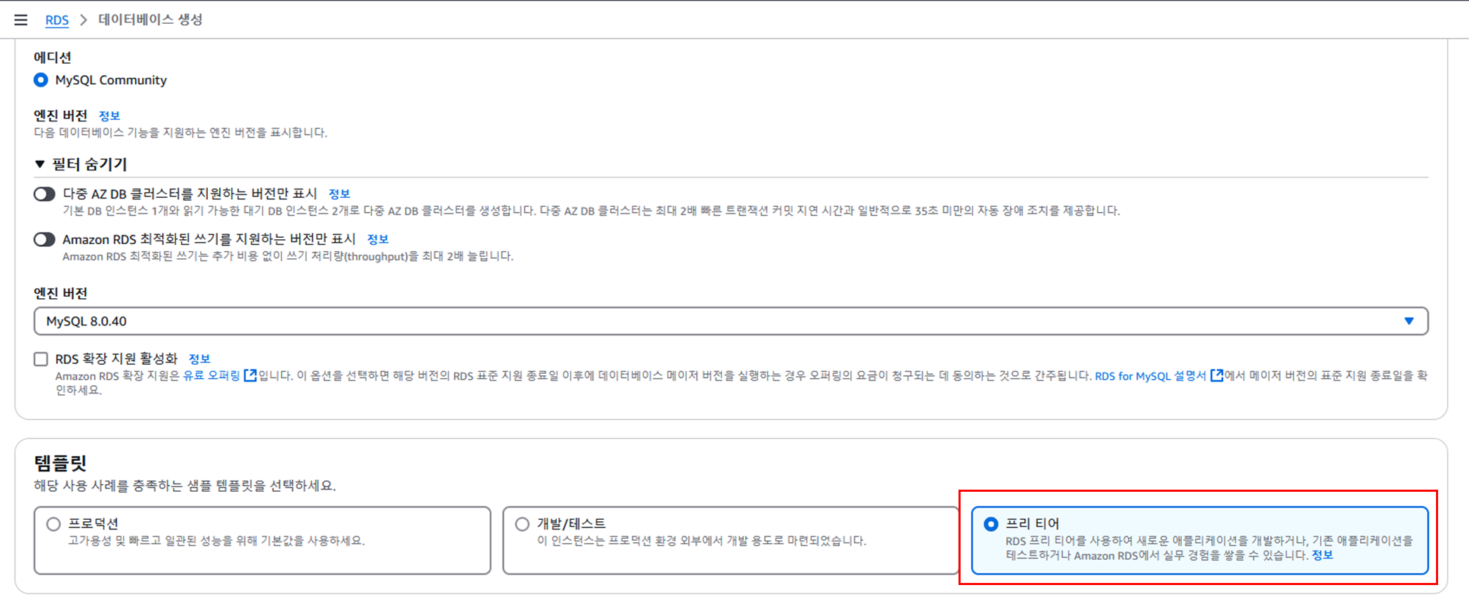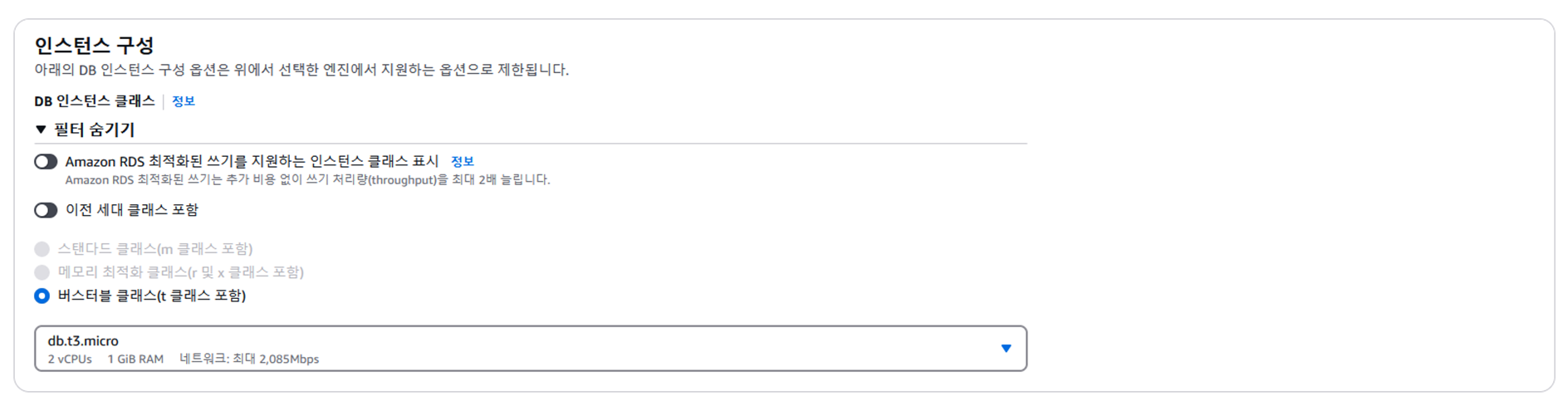 ์ธ์คํด์ค ๊ตฌ์ฑ์์๋ db.t3.mictro๋ฅผ ์ ํํ๋ค.(2025๋ 2์6์ผ ํ์ฌ ๊ธฐ์ค ํ๋ฆฌํฐ์ด ์ง์)