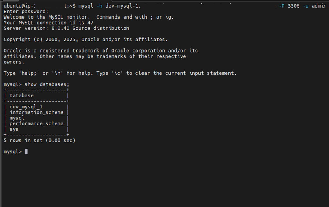mysql -h {์๋ํฌ์ธํธ} -p {ํฌํธ} -u {master ๊ณ์ }