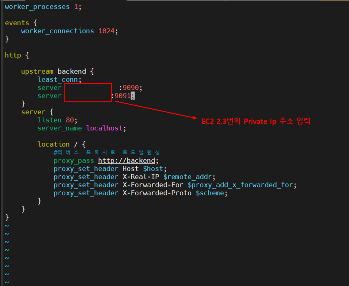 upstream์์ server๋ค์ ์์ดํผ๋ฅผ EC2 2,3๋ฒ์ private IP๋ฅผ ์ ๋ ฅํ๋ค.