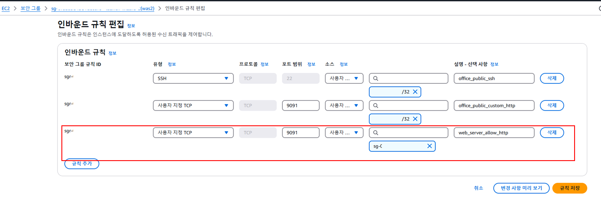 3๋ฒ ์งธ EC2์์๋ 9091ํฌํธ๋ฅผ 1๋ฒ ์งธ EC2 ์ธ์คํด์ค์๊ฒ ํ์ฉํด์คฌ๋ค.