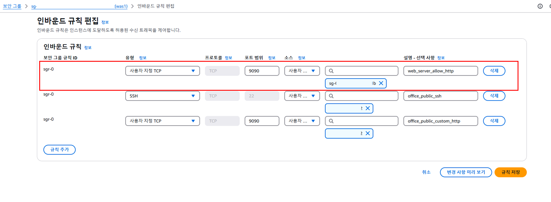 2๋ฒ ์งธ EC2์์ WAS์์ 9090ํฌํธ๋ฅผ ์ฌ์ฉํ ๊ฑฐ๋ผ 1๋ฒ ์งธ EC2 ์ธ์คํด์ค์๊ฒ 9090ํฌํธ๋ฅผ ์ด์ด์คฌ๋ค.