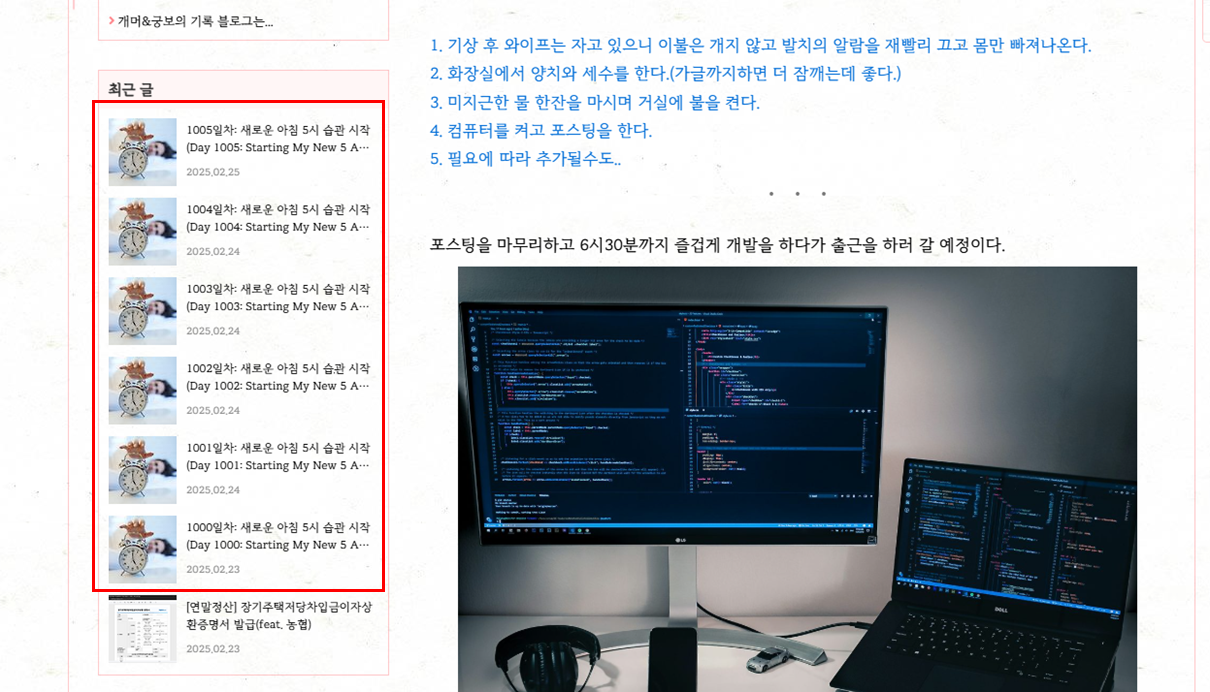 ์ด ํฌ์คํ ์ ๋๋ต 3์ฃผ ๋์ ๋งค์ผ ์ค์ 5์์ ๊ธฐ์ํ๋ ์ต๊ด์ ๋ง๋ค๊ธฐ ์ํ ๊ณผ์ ์ ๊ธฐ๋กํ ๊ด์ฐฐ์ผ์ง์ ๋๋ค.