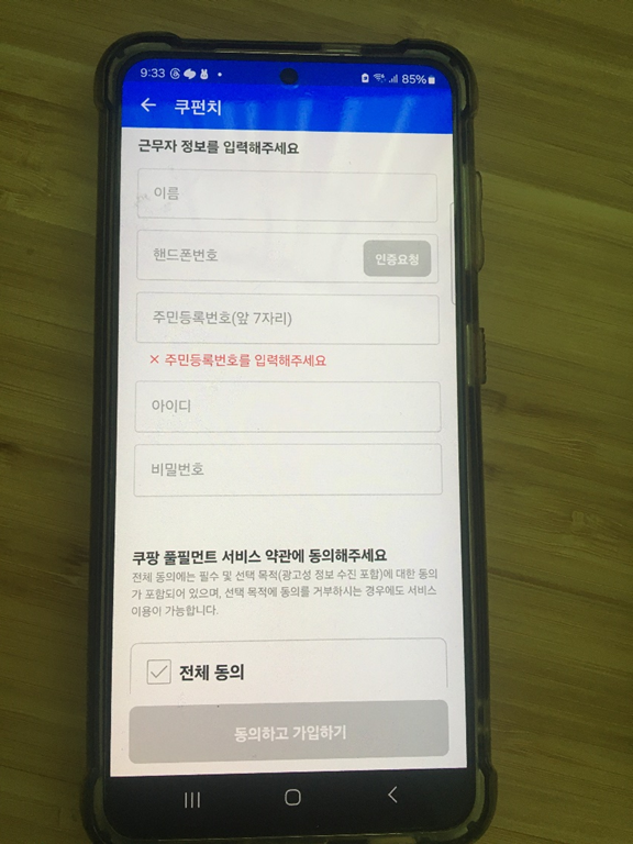์ด๋ฆ, ํธ๋ํฐ๋ฒํธ(์ธ์ฆ ํ์), ์ฃผ๋ฏผ๋ฒํธ ์ 7์๋ฆฌ ๋ฑ์ ์ ๋ ฅ ํ ์ฝ๊ด ๋์ ํ ๊ฐ์ ํ๊ธฐ๋ฅผ ๋๋ฅธ๋ค.