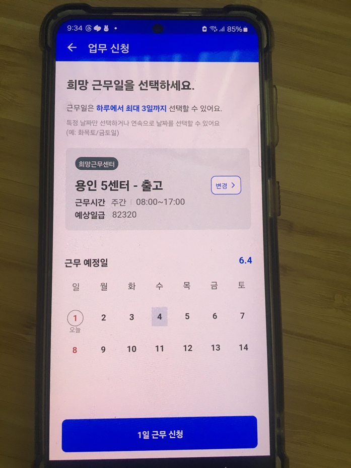 ๋ง์ง๋ง์ผ๋ก ํฌ๋ง ๊ทผ๋ฌด์ผ์ ์ ํ ํ ํ๋น ๊ทผ๋ฌด ์ ์ฒญ์ ๋๋ฅด๋ฉด ์ ๋ฌด ์ ์ฒญ์ด ์๋ฃ๋๋ค.