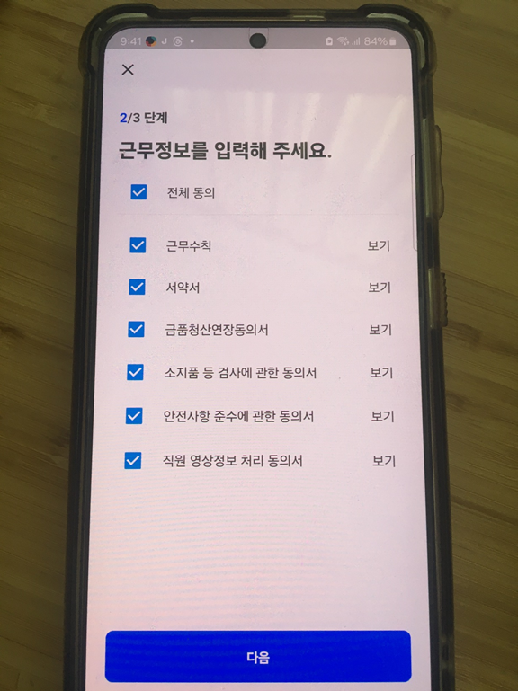 ๊ทธ๋ค์ ์ถ๊ทผ ๋ฐ์คํฌ์์ ์๋ฐ์ฝ๋, ์ฟ ํ์น ์ฒดํฌ์ธ ํ๋ฉด, ์ ๋ถ์ฆ์ ์ ์ํ๊ณ ์ฌ์์ฆ์ ์๋ นํ๋ค.